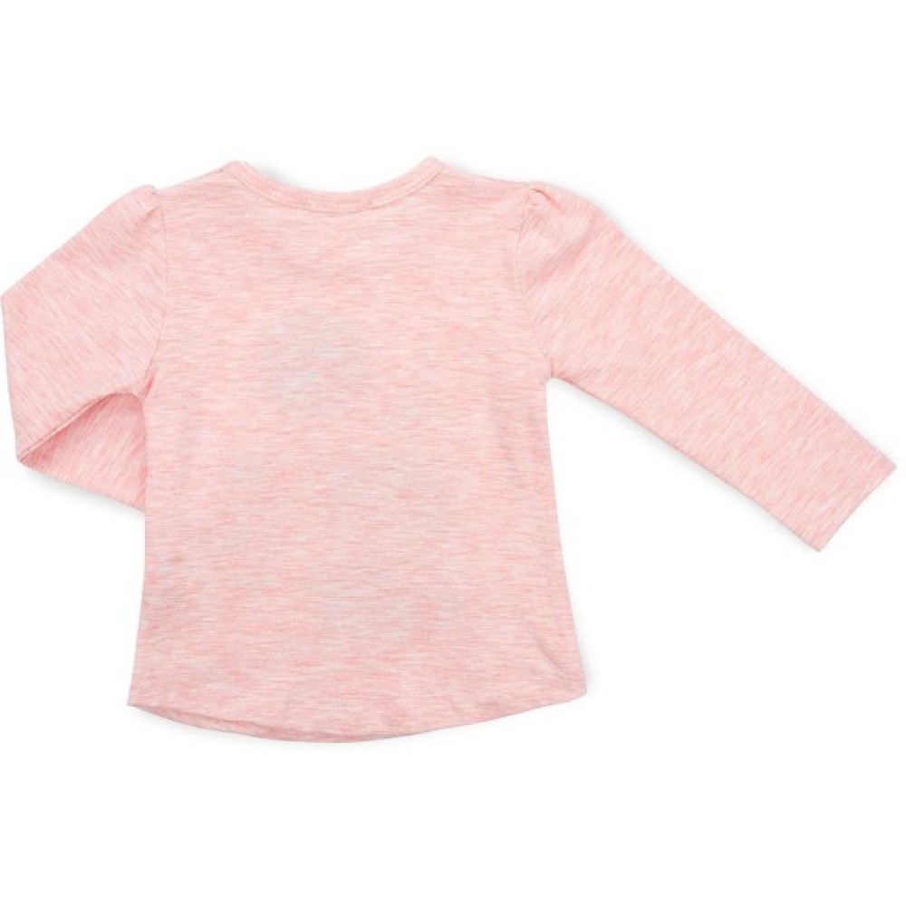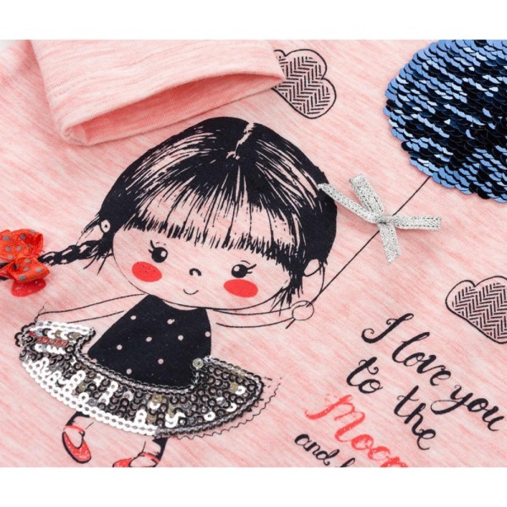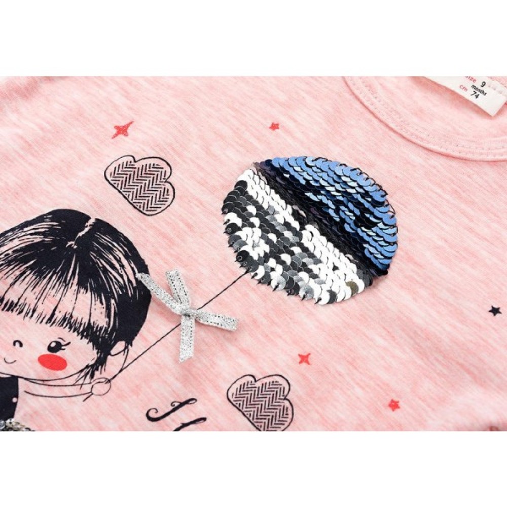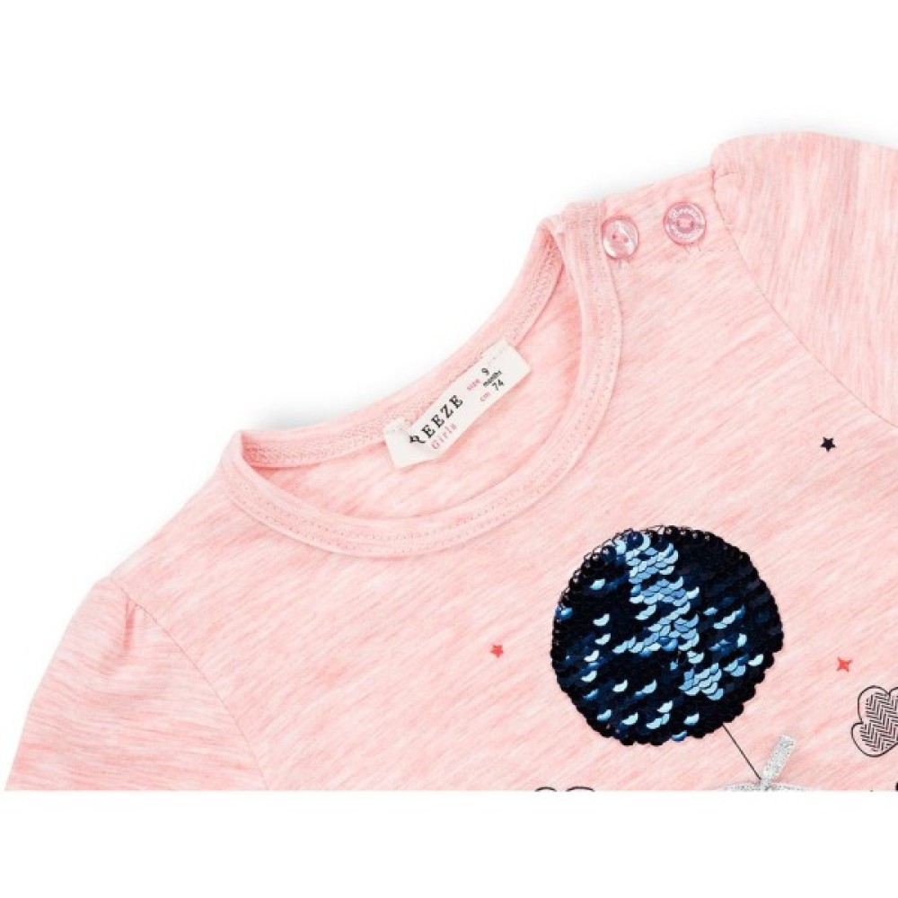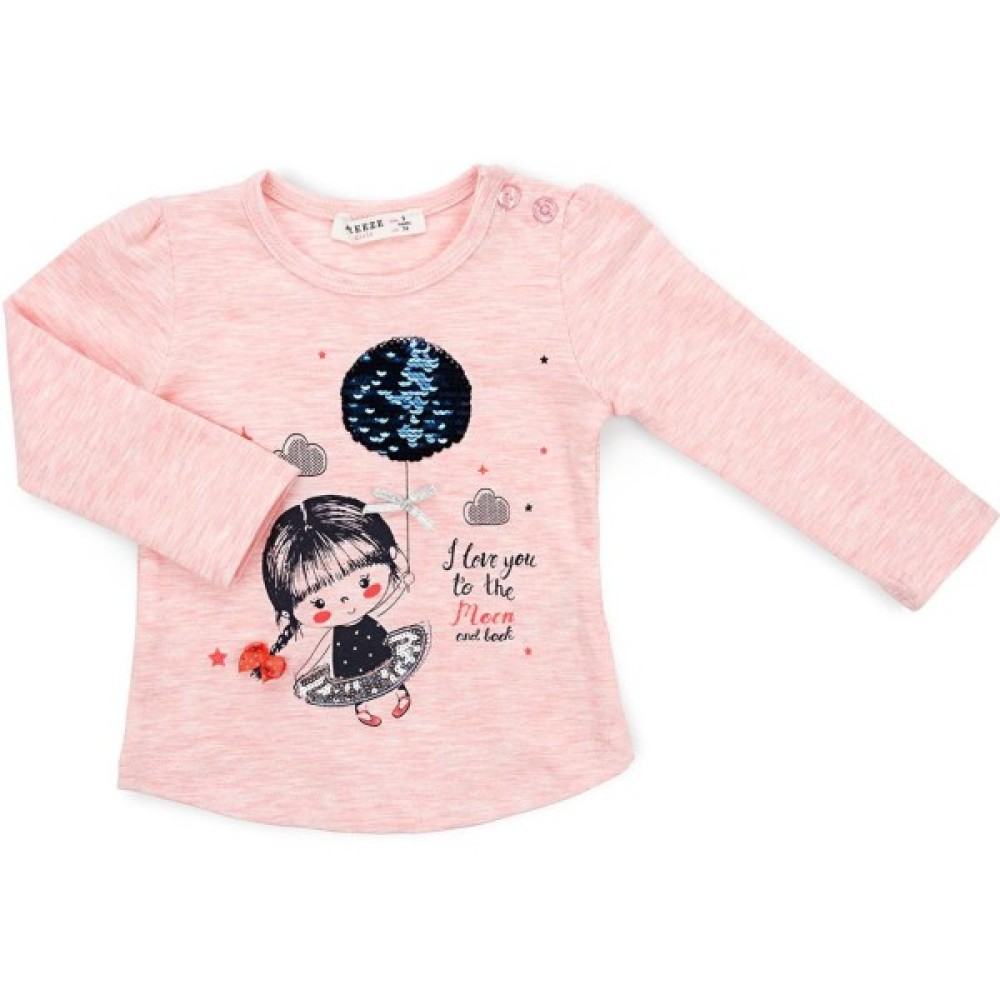 трохи розширеного А-силуету, з тонкого трикотажу, попереду прикрашений об'ємним принтом дівчинки з повітряною кулькою. Кулька виконана з паєток, які перевертаються та змінюють колір. Довгі рукава без манжет, прісборени по окату. Лінія низу лонгсліва заокруглена. Виріз горловини оброблений трикотажною бейкою. На лівому плечі застібка на фірмові перламутрові ґудзики, яка полегшить процес надягання.