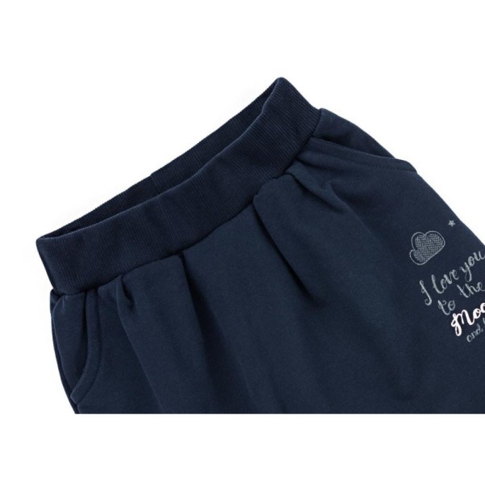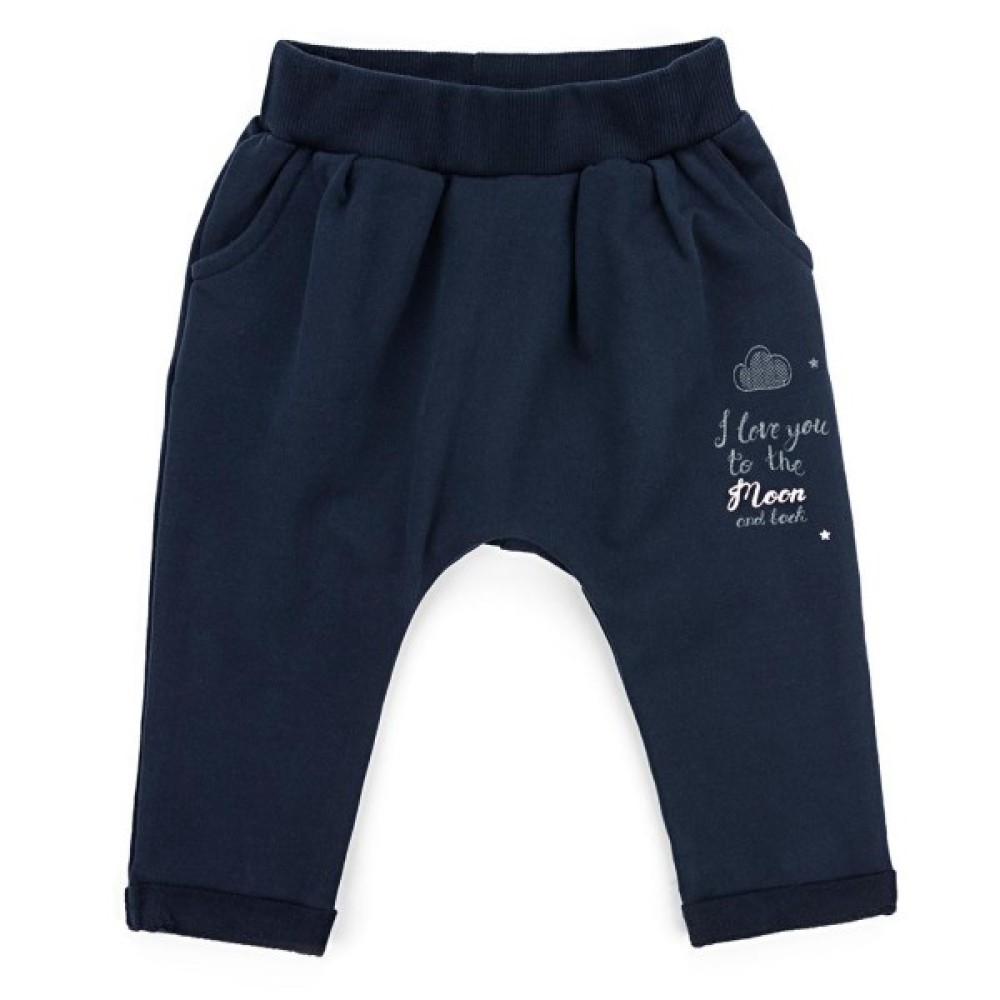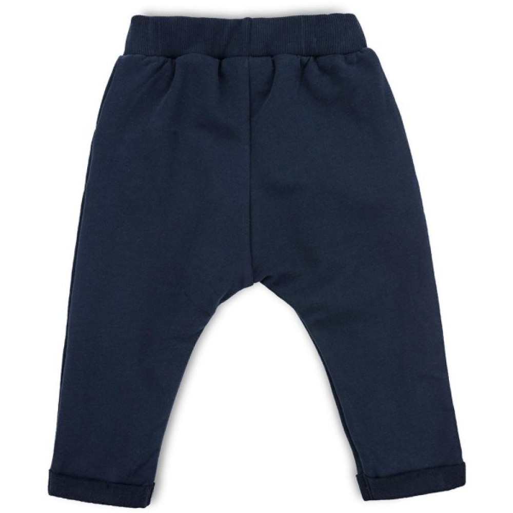 Зручні штанці темно-синього кольору, з двома передніми прорізними кишенями, з щільного трикотажу, з модними фіксованими заворотами по низу. Спереду штани вільні, в поясі зібрані складками і без середнього шва. Еластичний пояс з подвійною трикотажною «гумкою», посилений додатково вставленою широкою «гумкою», забезпечить дитині повну свободу рухів і оптимальну посадку по фігурі.