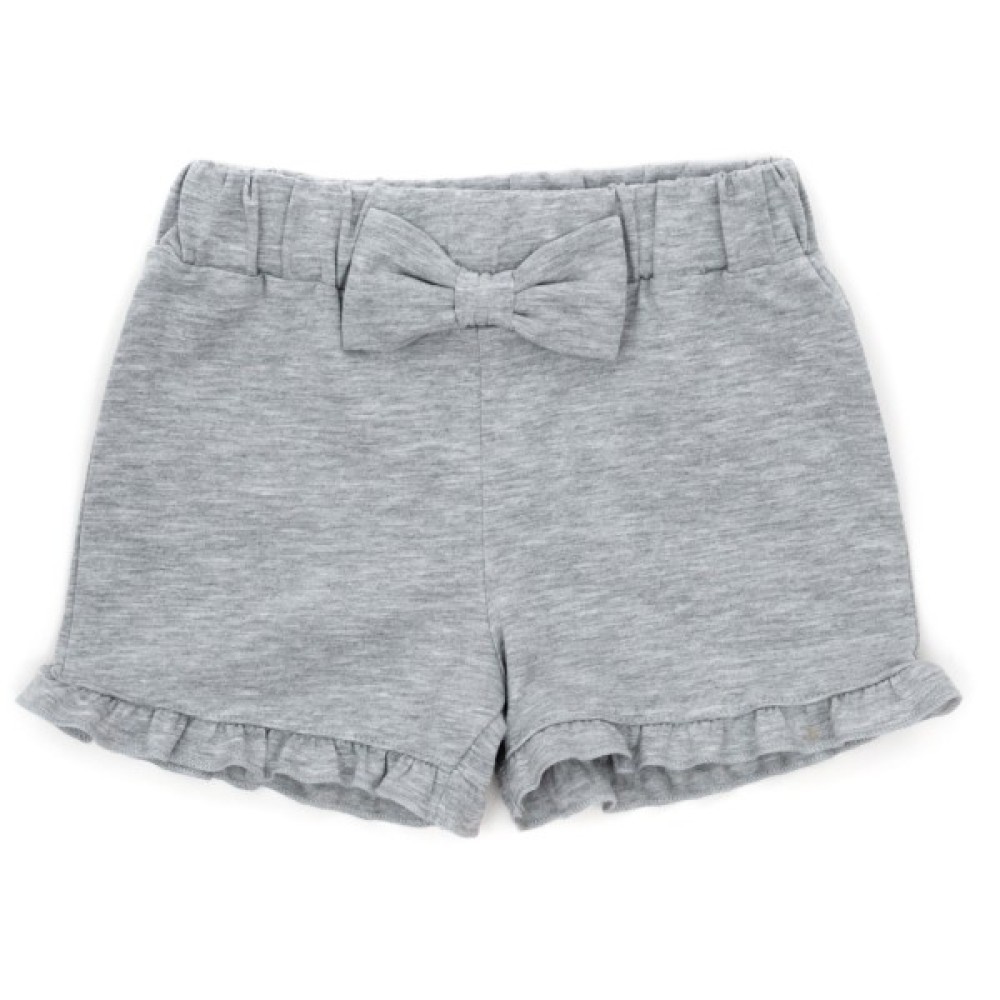 Зручні короткі шортики з еластичним трикотажним поясом на широкій резинці забезпечать оптимальну посадку по фігурі. Прикрашені на поясі трикотажним бантиком, а по низу - трикотажними рюшами.