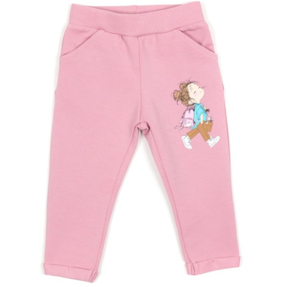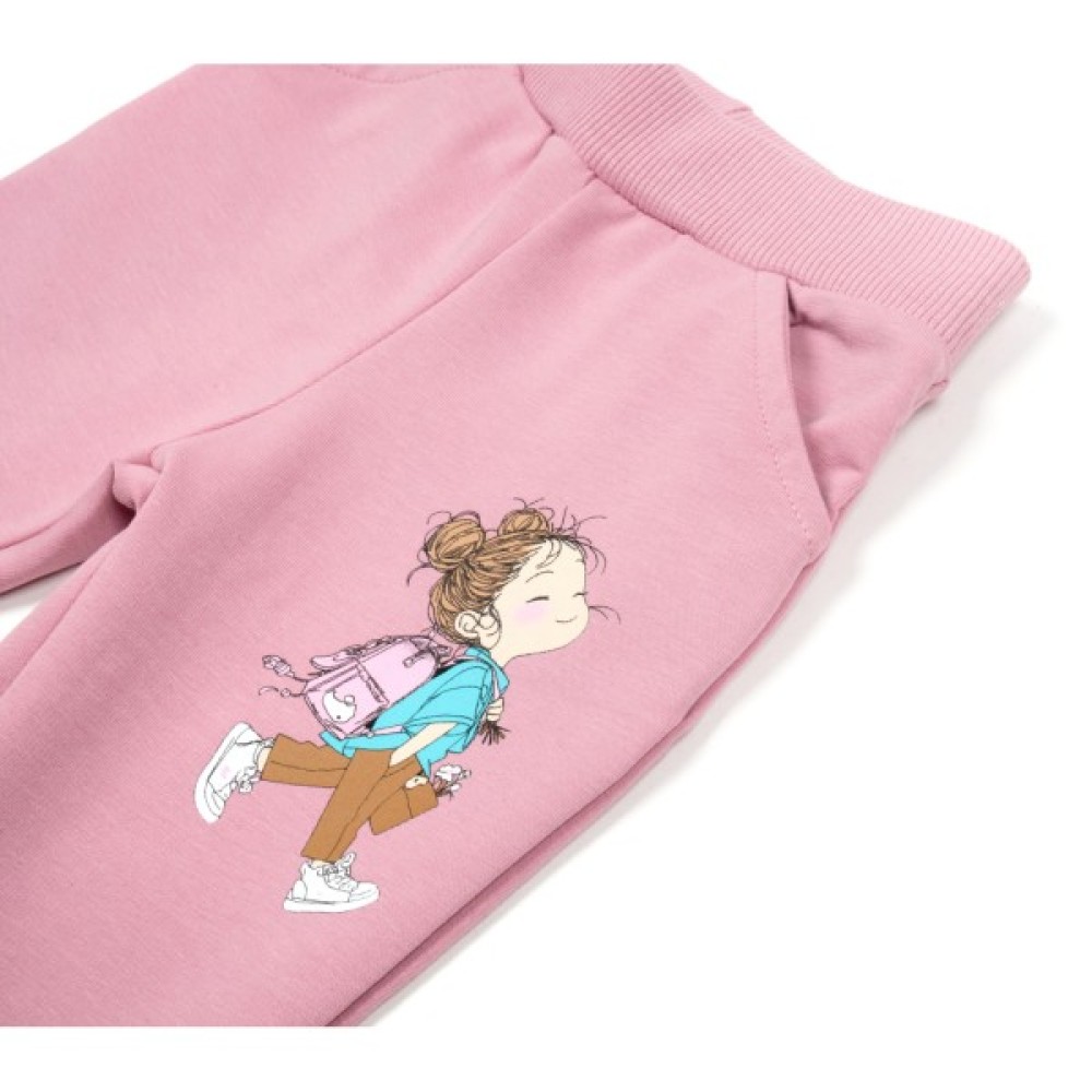 • Ефектний трикотажний набір приємного темно-рожевого кольору для дівчинки, прикрашений кольоровим симпатичним принтовим малюнком у вигляді дівчинки з рюкзачком.