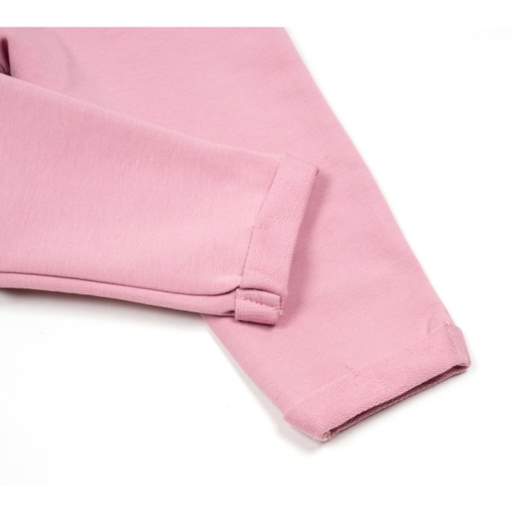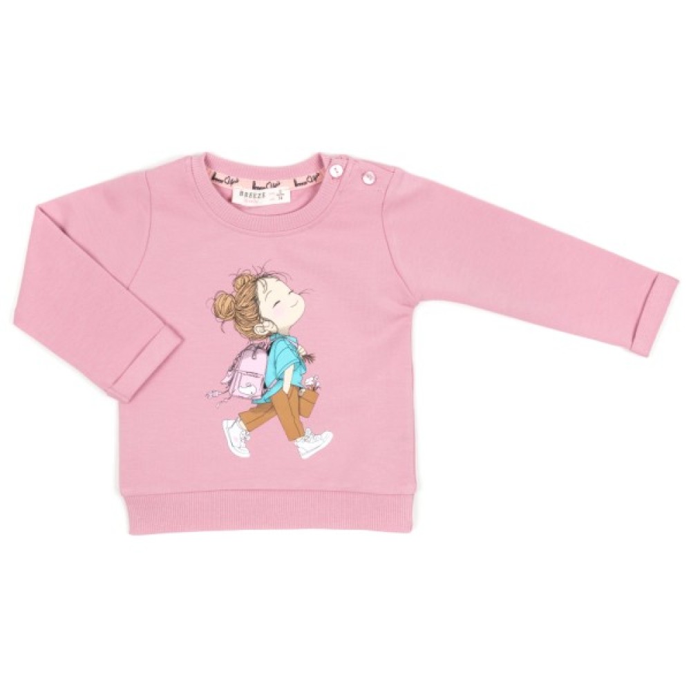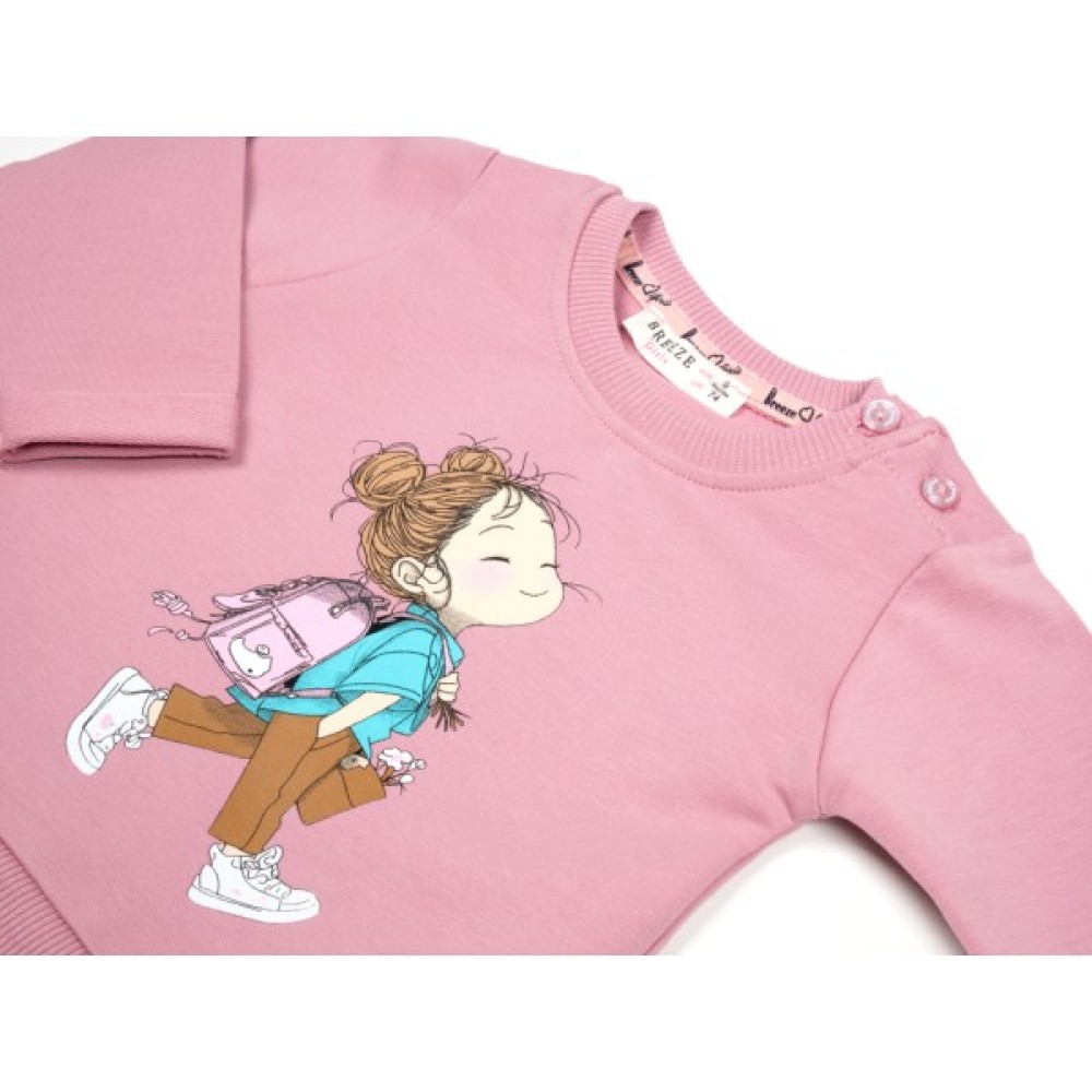 - Ефектний трикотажний набір приємного темно-рожевого кольору для дівчинки, прикрашений кольоровим симпатичним принтовим малюнком у вигляді дівчинки з рюкзачком.