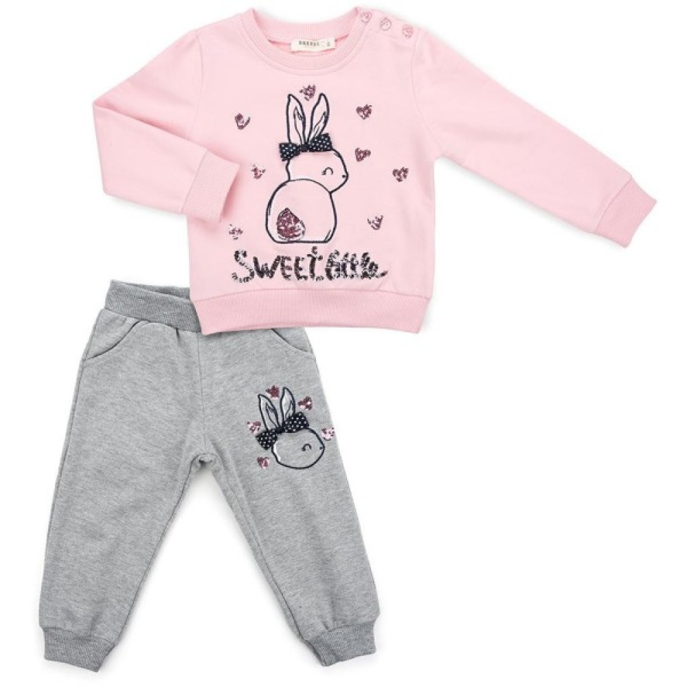 Милий комплект, що складається з ніжно-рожевого світшота і штанців приємного світло-сірого кольору дуже сподобається Вашій дитині!