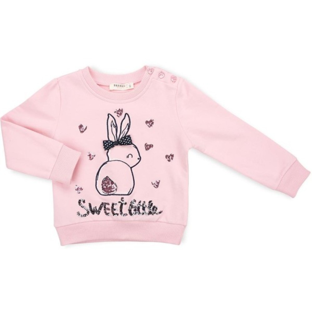 , якісно зшитий з м'якого, бархатистого, дуже приємного на дотик трикотажу. Прикрашений силуетом кролика, сердечками з паєток і написом з пайеток «Sweet little». Класичний круглий виріз горловини, манжети рукавів і низ світшота оформлені подвійною якісною трикотажною резинкою.