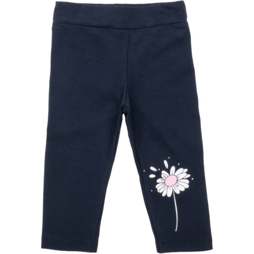 Лосини зручні, темно - синього кольору, під гумку в поясі, з лівого боку прикрашені такою ж квіточкою, як і на футболці.