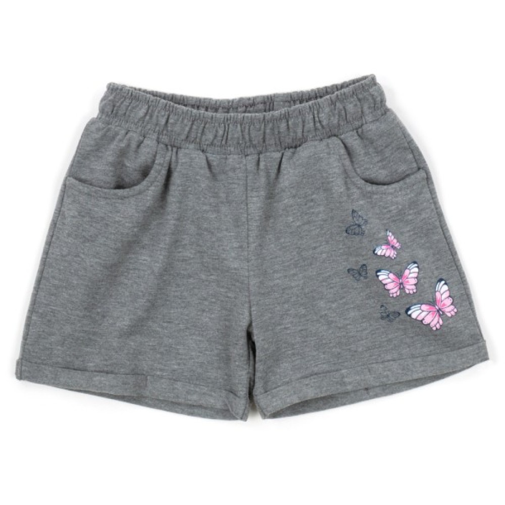 • Шортики зручні, легенькі, з двома передніми прорізними кишенями та під гумку в поясі, прикрашені з одного боку принтовими малюнками метеликів, як і на футболці. По низу також виконані фіксовані підвороти.
