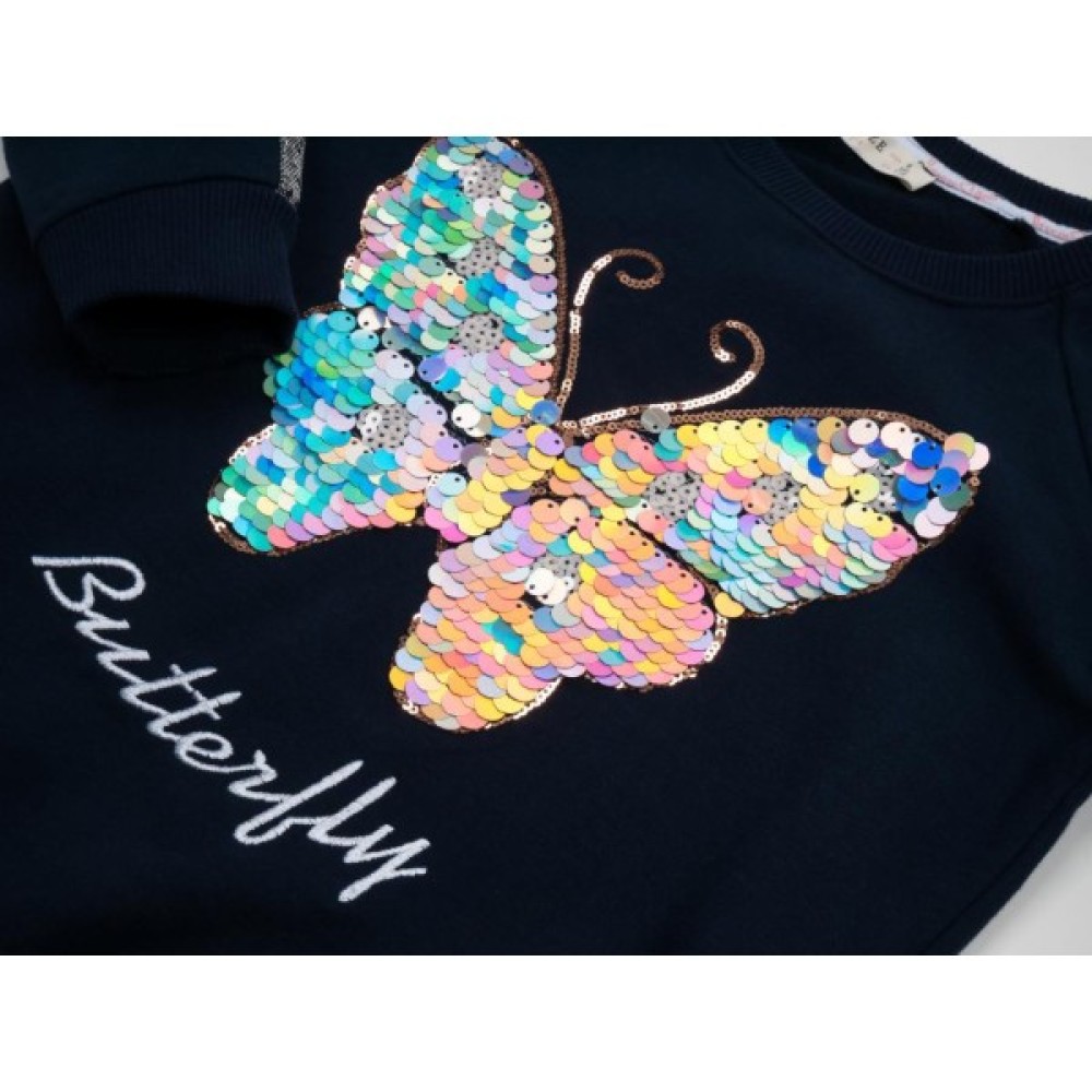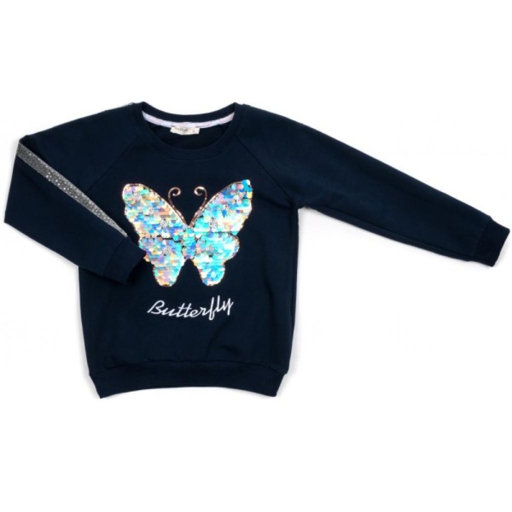 Кофта вільного крою, з довгими рукавами - «реглан». Попереду на світшоті настрочен красивий метелик з великих переливчатих паєток. По середній лінії рукавів настрочена красива срібляста тасьма. Манжети рукавів і лінія низу оброблені подвійною якісною трикотажною «гумкою».