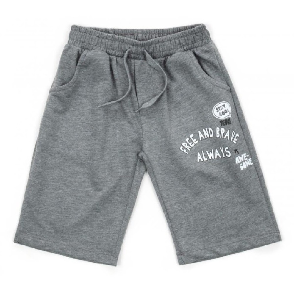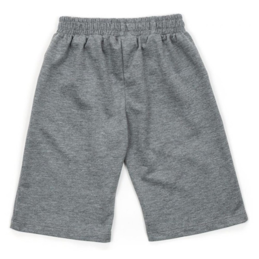 Шорти прямі, подовжені, сірого меланжевого кольору, з прорізними кишенями. Пояс середньої ширини (3 см), на гумці, доповнений декоративним шнурком і на лівій частині шорт написами як на футболці.