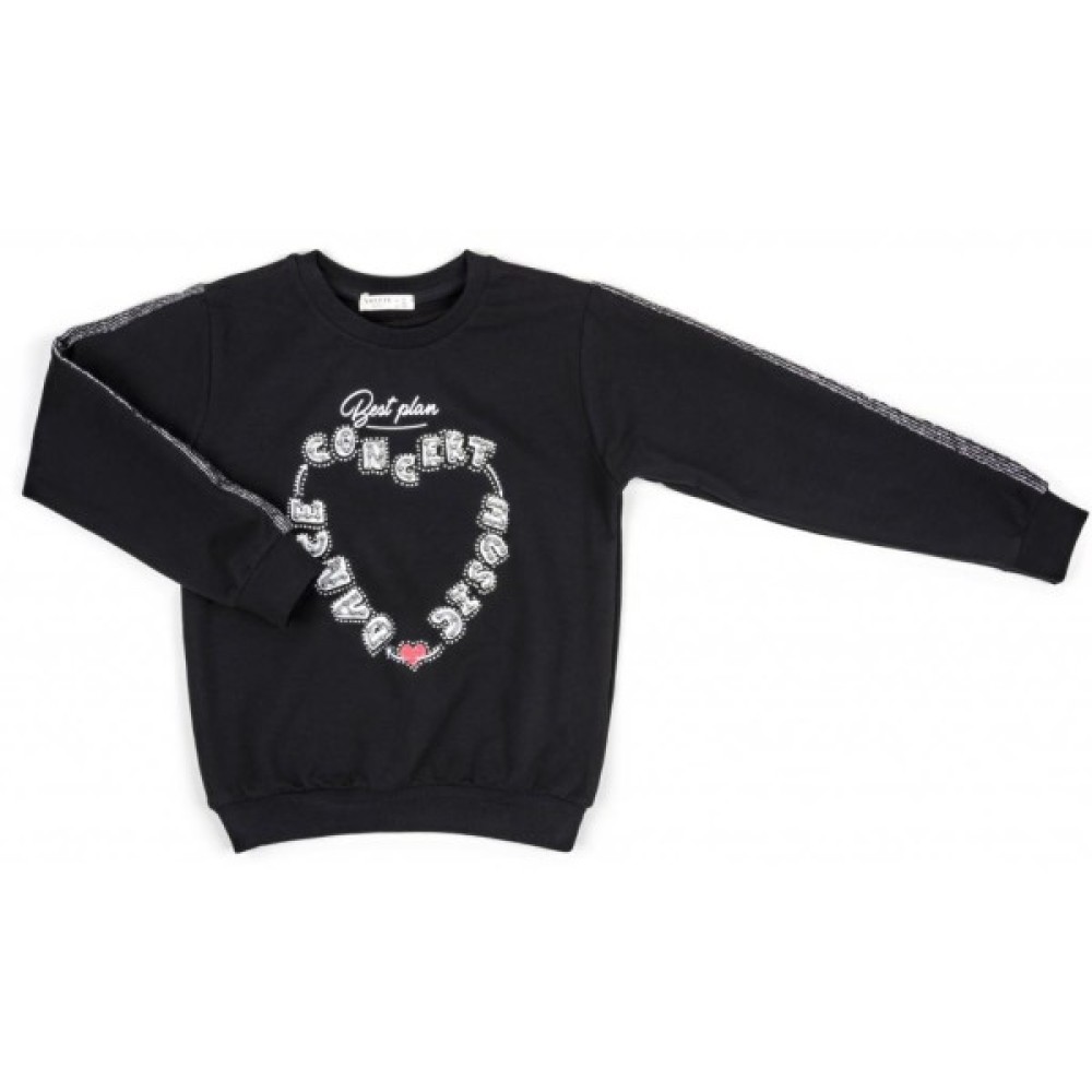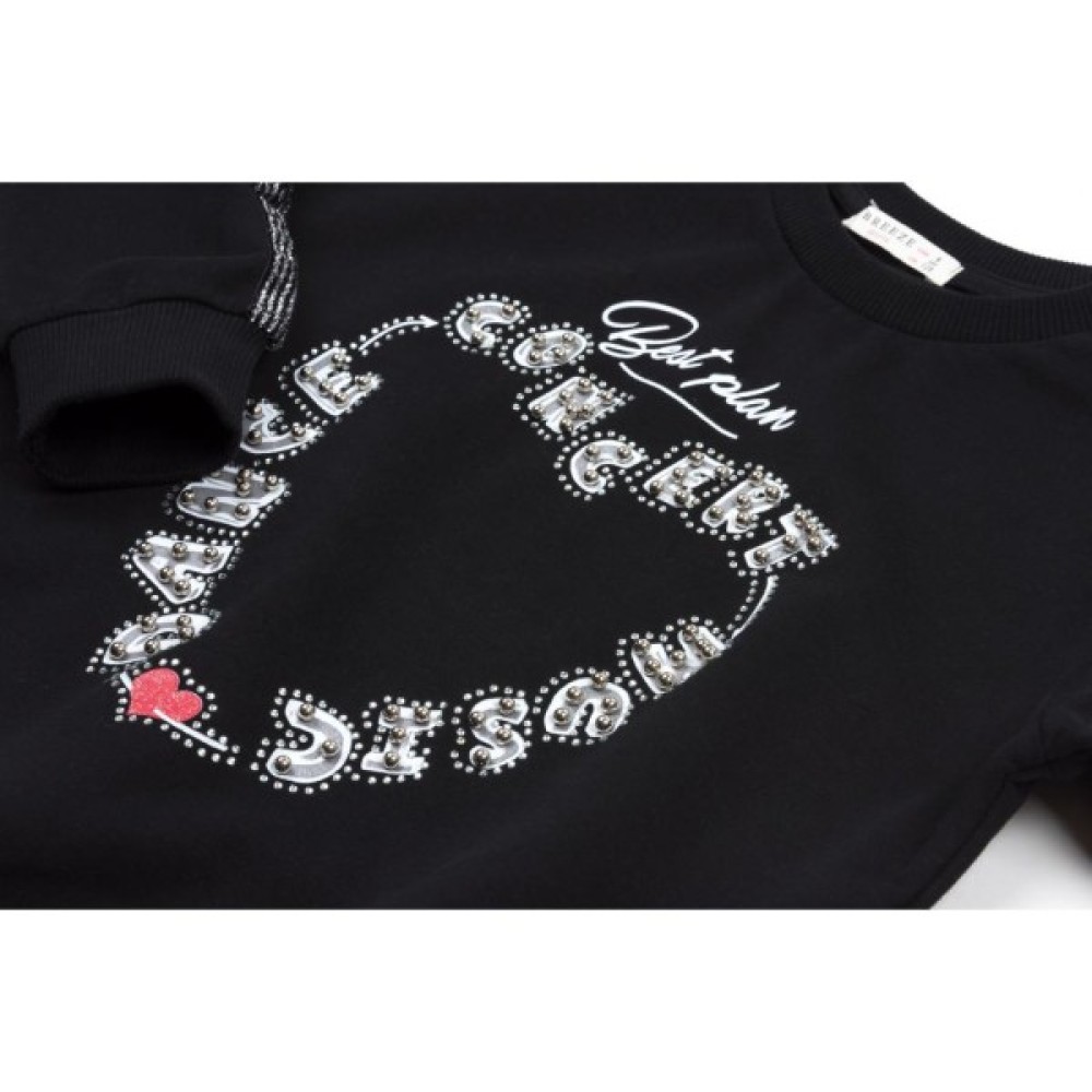 Написи розташовані в формі серця. Контури і середина слів прикрашені сріблястими намистинами і стразами. Посередині рукава пущені сріблясто - чорні лампаси. Кругла горловина, манжети рукавів і низ світшота оброблені подвійною якісною трикотажною «гумкою».