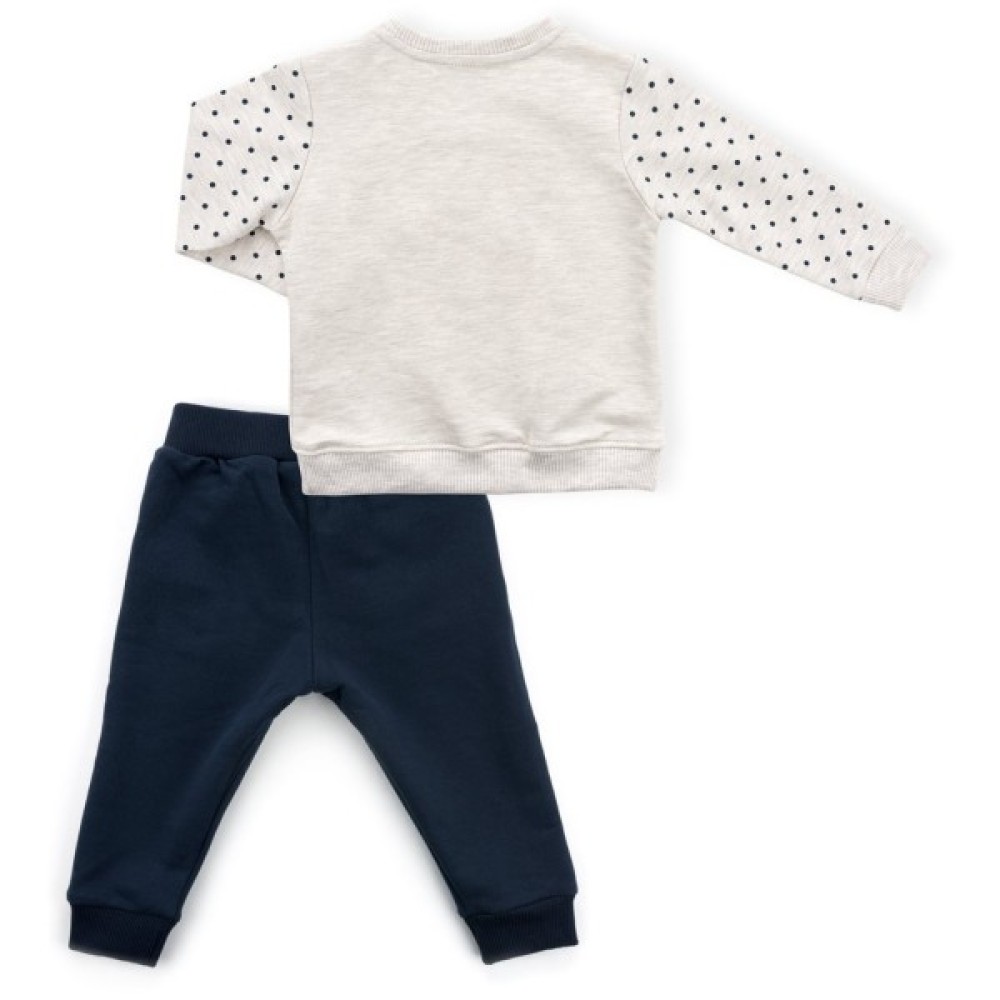 Модний барвистий комплект для дівчинки складається з світло-бежевого меланжевого світшота і контрастних темно-синіх штанів.