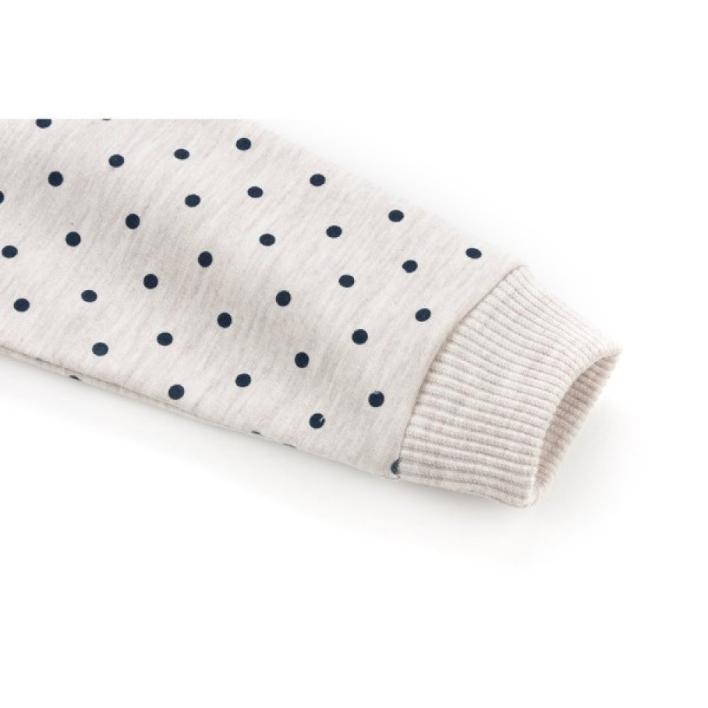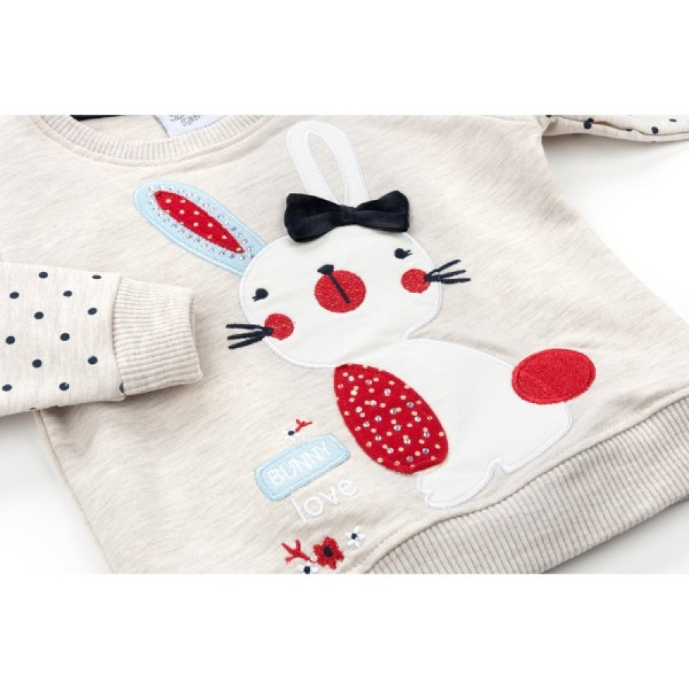 Затишний світшот (світшот (sweatshirt) - різновид светра, скроєний подібно толстовці. Назва утворена від поєднання англійських слів «sweater» (светр) і «shirt» (сорочка). Світшоти шиються з щільного трикотажу, іноді утеплений всередині ворсом, флісом і т. д.) вільної форми з довгими рукавами в "горошок". Класичний круглий виріз горловини, манжети і низ світшота оформлені трикотажною резинкою. Прикрашає цей світшот об'ємна різнобарвна аплікація зайчика з атласним бантиком на вушкі.