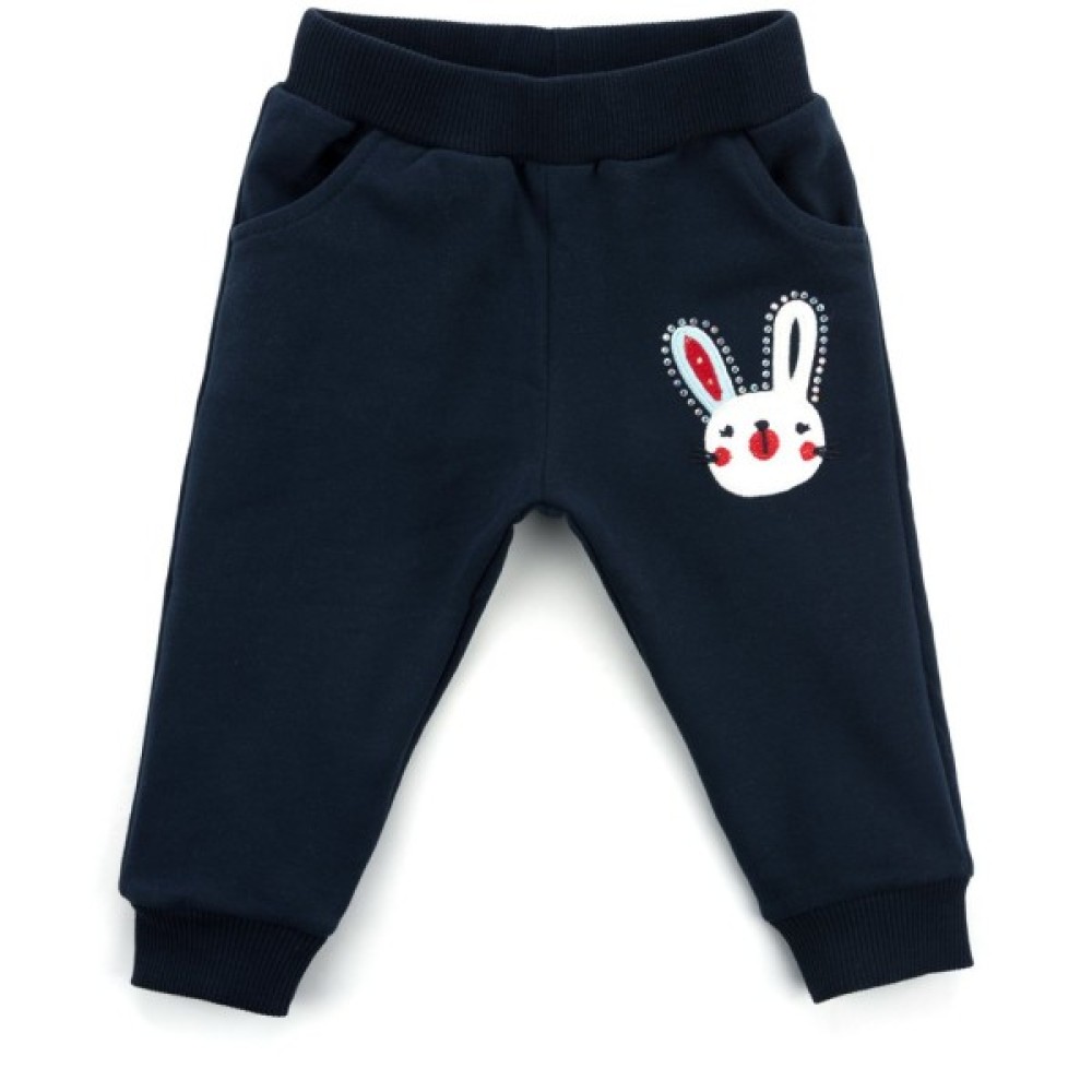Зручні брюки з щільного двохниткового трикотажу темно-синього забарвлення з двома прорізними кишенями і м'яким поясом. У поясі є внутрішня гумка. Ліву штанину штанців прикрашає елемент такої ж аплікації зайчика зі стразами, як і на світшоті. Тканина в комлекті дуже м'яка, бархатиста і приємна на дотик.