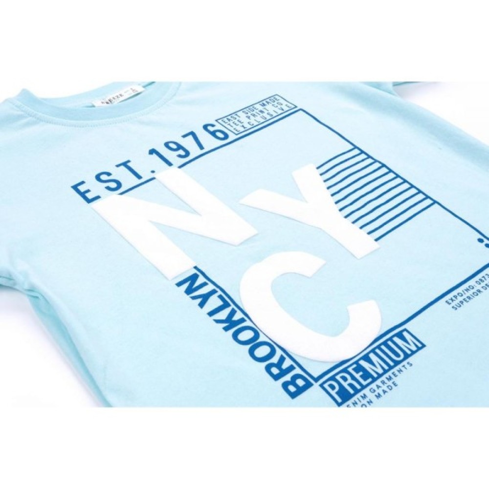 Ніжно-блакитного відтінку футболка прямого силуету з об'ємним принтом спереду. Горловина кругла, оброблена м'якою трикотажною резинкою. Шорти середньої довжини яскравого синього кольору з двома прорізними кишенями. Пояс еластичний на гумці з декоративним шнурком.