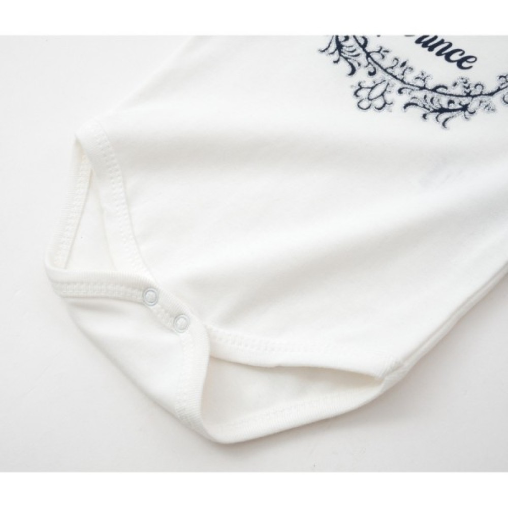• Боді з довгими рукавами, застібкою внизу, між ніжками, на дві кнопочки, та з горловиною-човником з запАхом на плечиках, що дуже зручно при надяганні. Боді виконаний з трикотажу молочно-білого кольору та прикрашений симпатичним принтовим малюнком з глітерними блискітками.