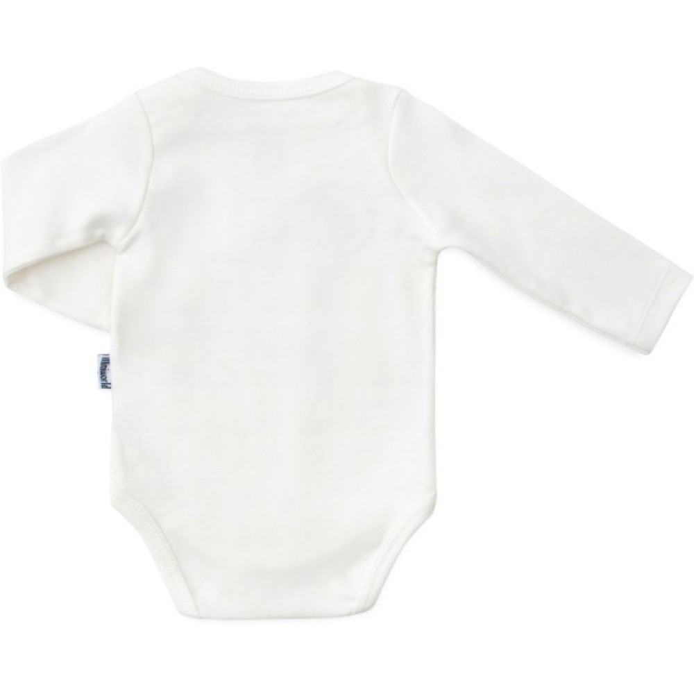 • Боді з довгими рукавами, застібкою внизу, між ніжками, на дві кнопочки, та з горловиною-човником з запАхом на плечиках, що дуже зручно при надяганні. Боді виконаний з трикотажу молочно-білого кольору та прикрашений симпатичним принтовим малюнком з глітерними блискітками та невеличким трикотажним бантиком.