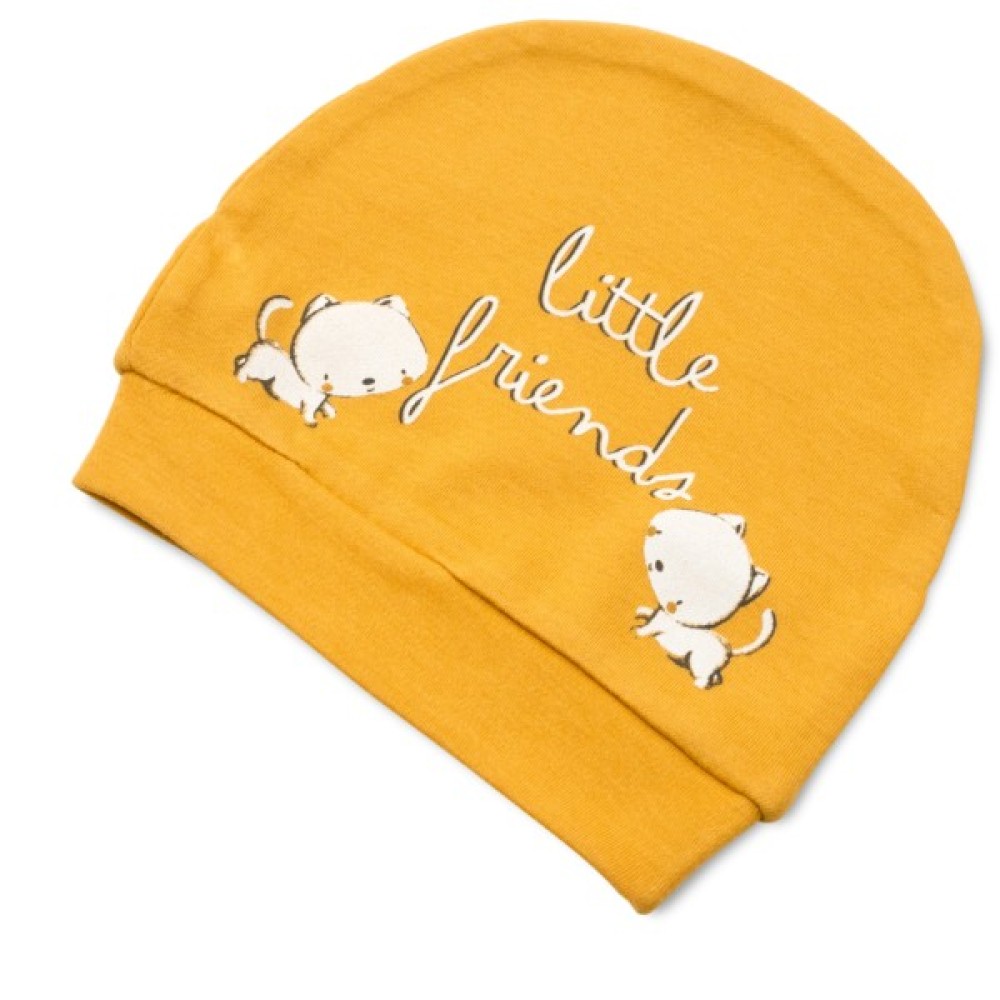 - Шапочка зручна, також у темно-жовтому кольорі як і штанці, без зав'язок, на м'якій трикотажній гумці, прикрашена симпатичним контрастним принтовим малюнком.