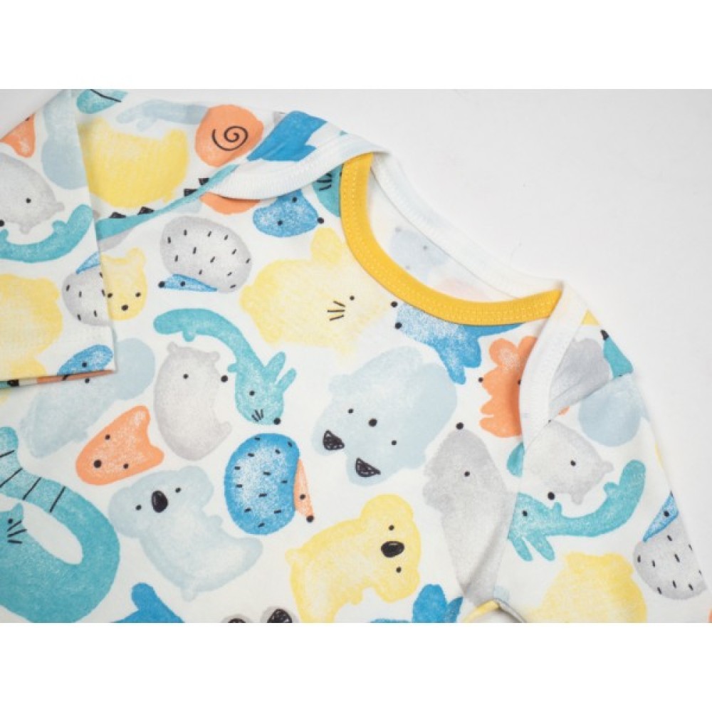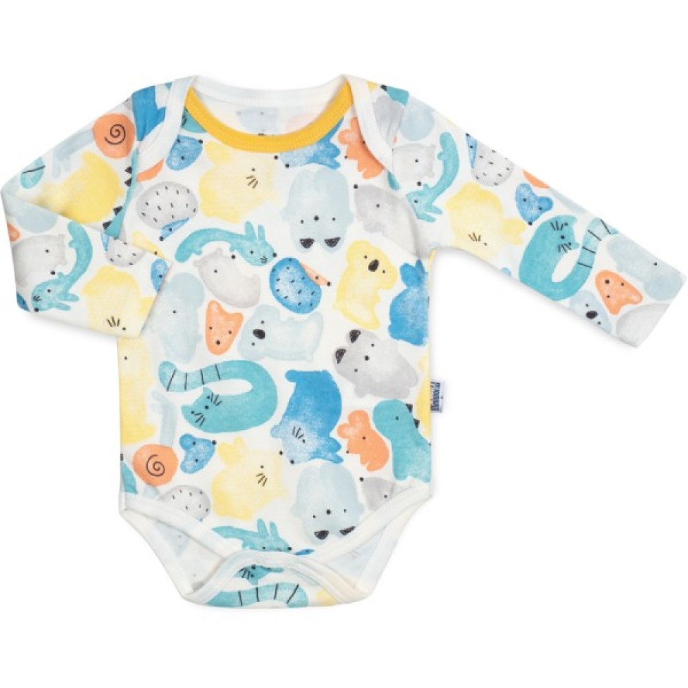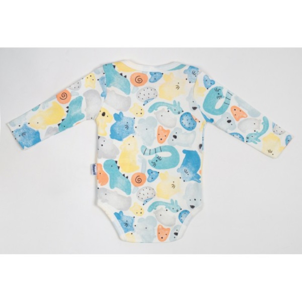 • Боді з довгими рукавами, застібкою внизу, між ніжками, на дві кнопочки, та з горловиною-човником з запАхом на плечиках, що дуже зручно при надяганні, виконаний в кремовому кольорі з кольоровими малюночками різних котиків.