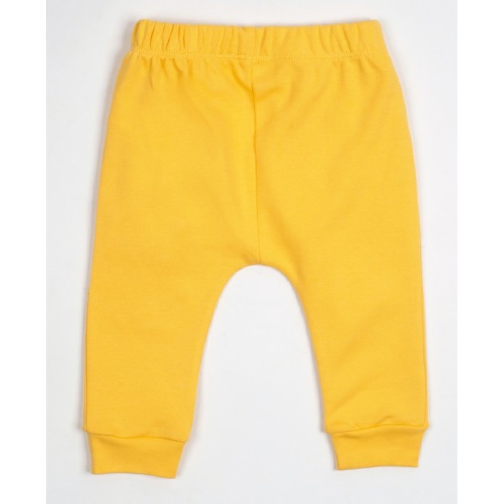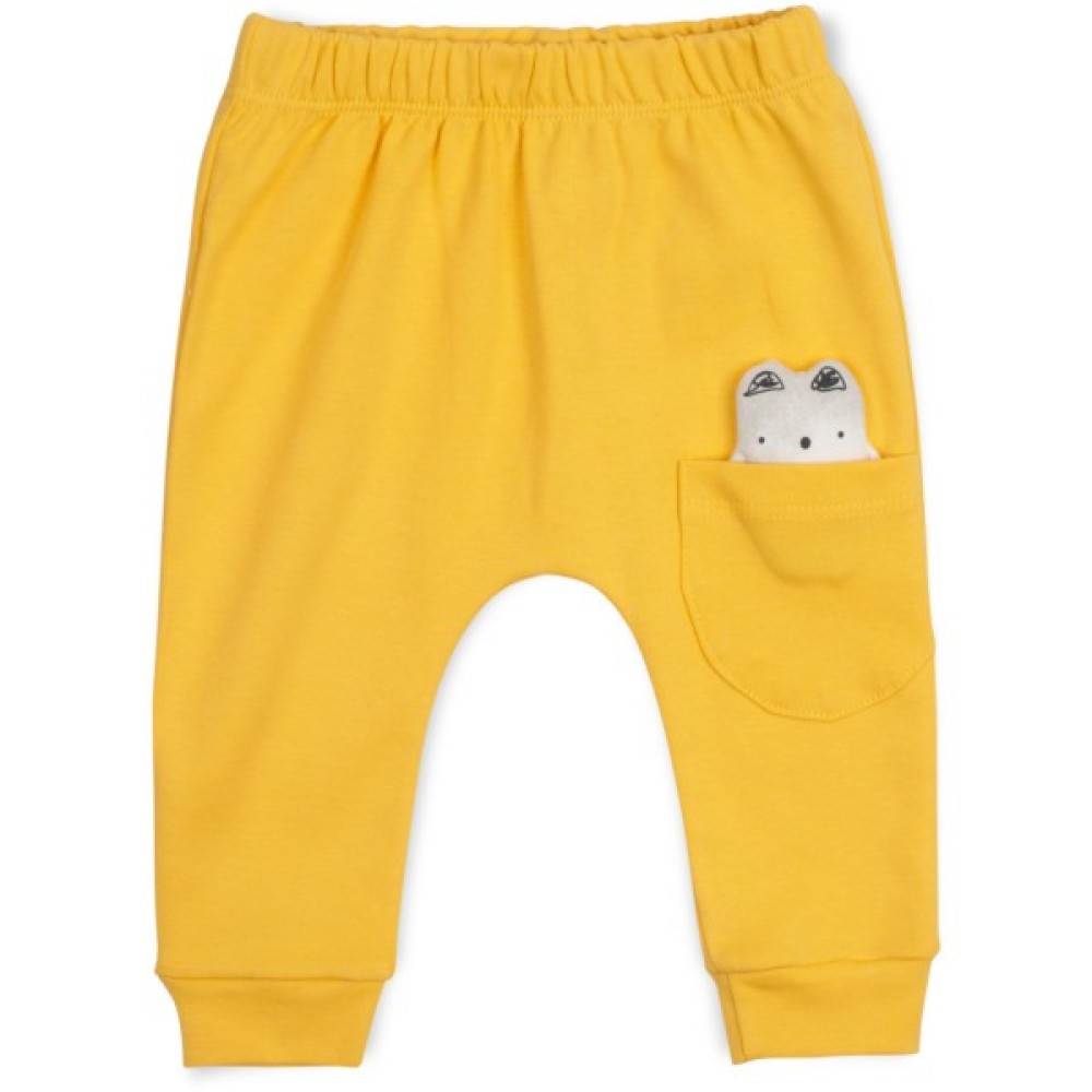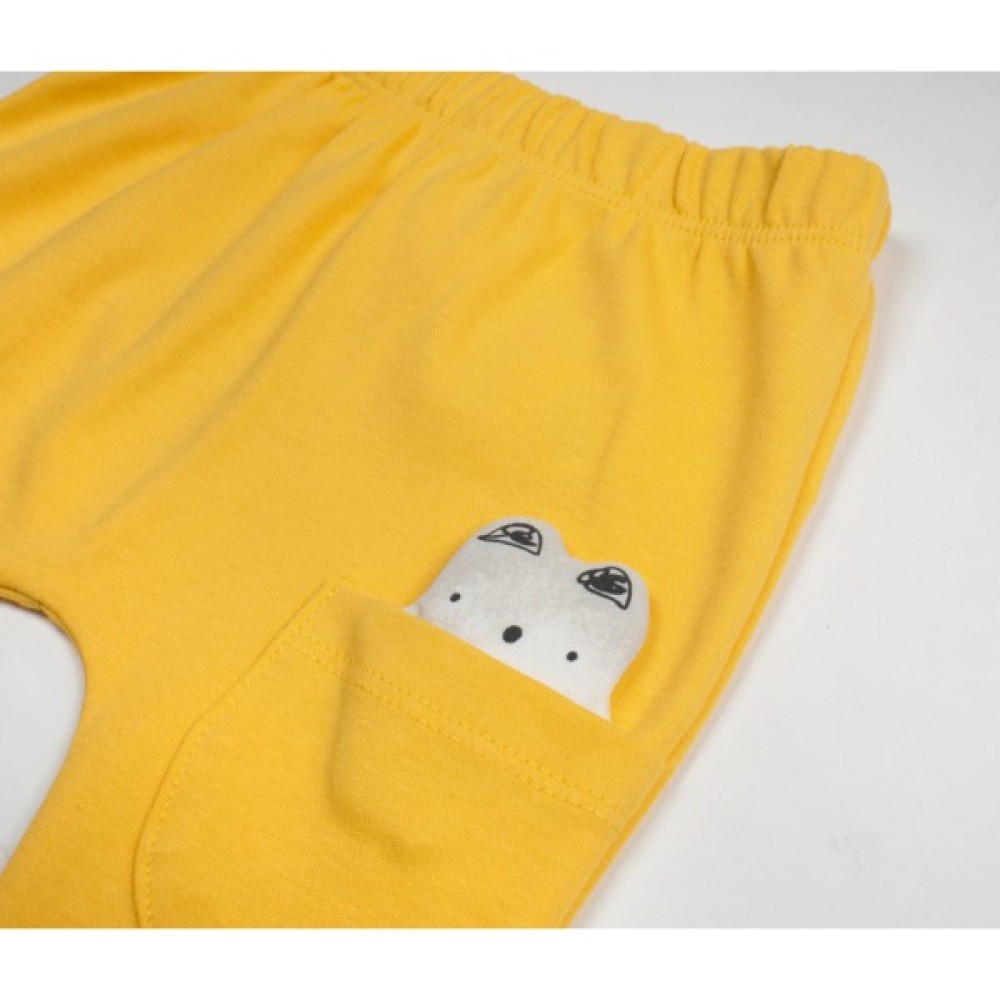 • Штанці приємного жовтого кольору, на трикотажних манжетах, зі зручною посадкою під підгузок, без окремо вшитого поясу, на еластичній гумці всередині, прикрашені на коліні накладною кишенею з аплікацією м'якенького котика.