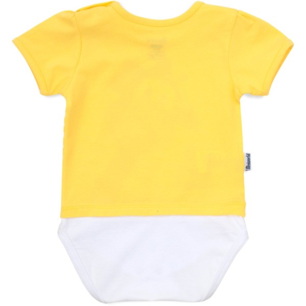 • Боді з короткими рукавами, застібкою внизу, між ніжками, та на плечевому шві на кнопочки, з круглою, неглибокою горловиною, виконаний з трикотажу у поєднанні двох кольорів - теплого приємного жовтого кольору та білого, та прикрашений спереду симпатичним кольоровим принтовим веселим малюнком жирафки.