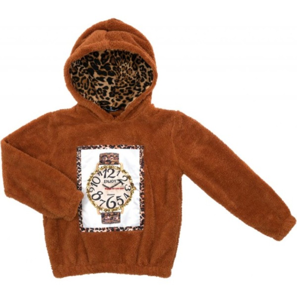 Худі вільний, прямого силуету, з капюшоном на трикотажній підкладці тигрового забарвлення, зшитий з м'якого ніжного плюшу теплого, світло-коричневого кольору неймовірно приємного на дотик. Перед прикрашений яскравою, об'ємною атласною аплікацією наручного годинника, розшитого намистинами і паєтками. Краї довгих рукавів і низ світшоту підвернуті і зібрані на гумку.