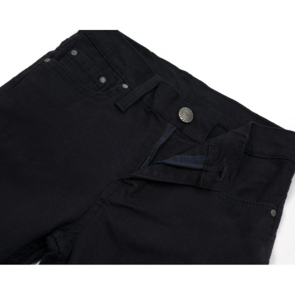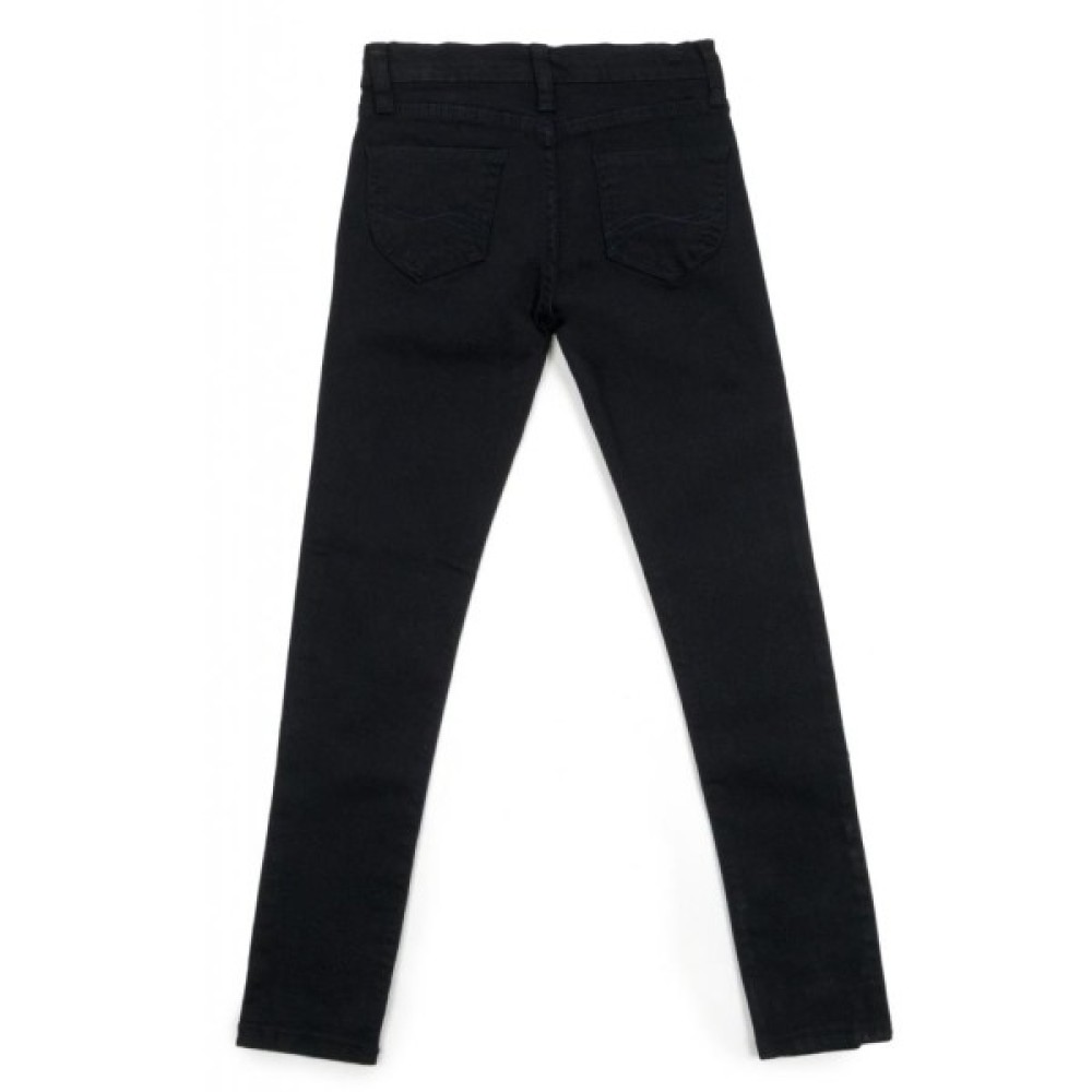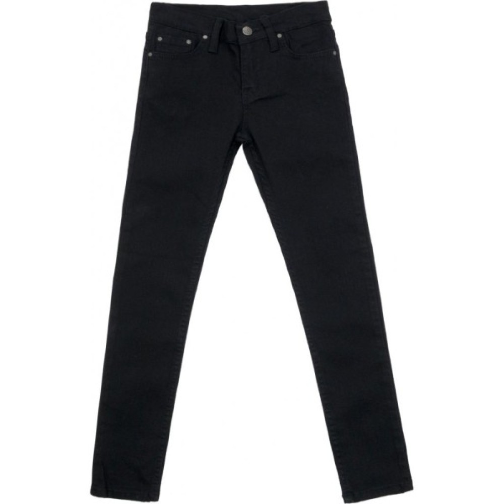 Зручні, стрейчеві, завужені джинси-скіні - класична 5-й кишенькова модель, виконана з щільного деніму чорного кольору. Застібаються на металевий ґудзик-кнопку і на капронову блискавку з металевим бігунком. Краї кишень спереду посилені металевими блочками.