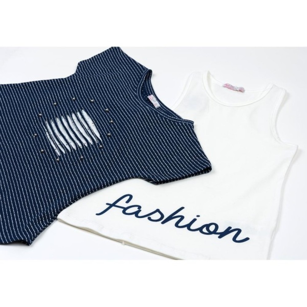 • Майка - подовжена, приємного молочного кольору, спинка - борцовка, не надто вузька. Пройми і горловина оброблені еластичною бейкою з такого ж трикотажу. Трикотаж тонкий, м'який, приємний на дотик. Внизу прикрашена написом «fashion».