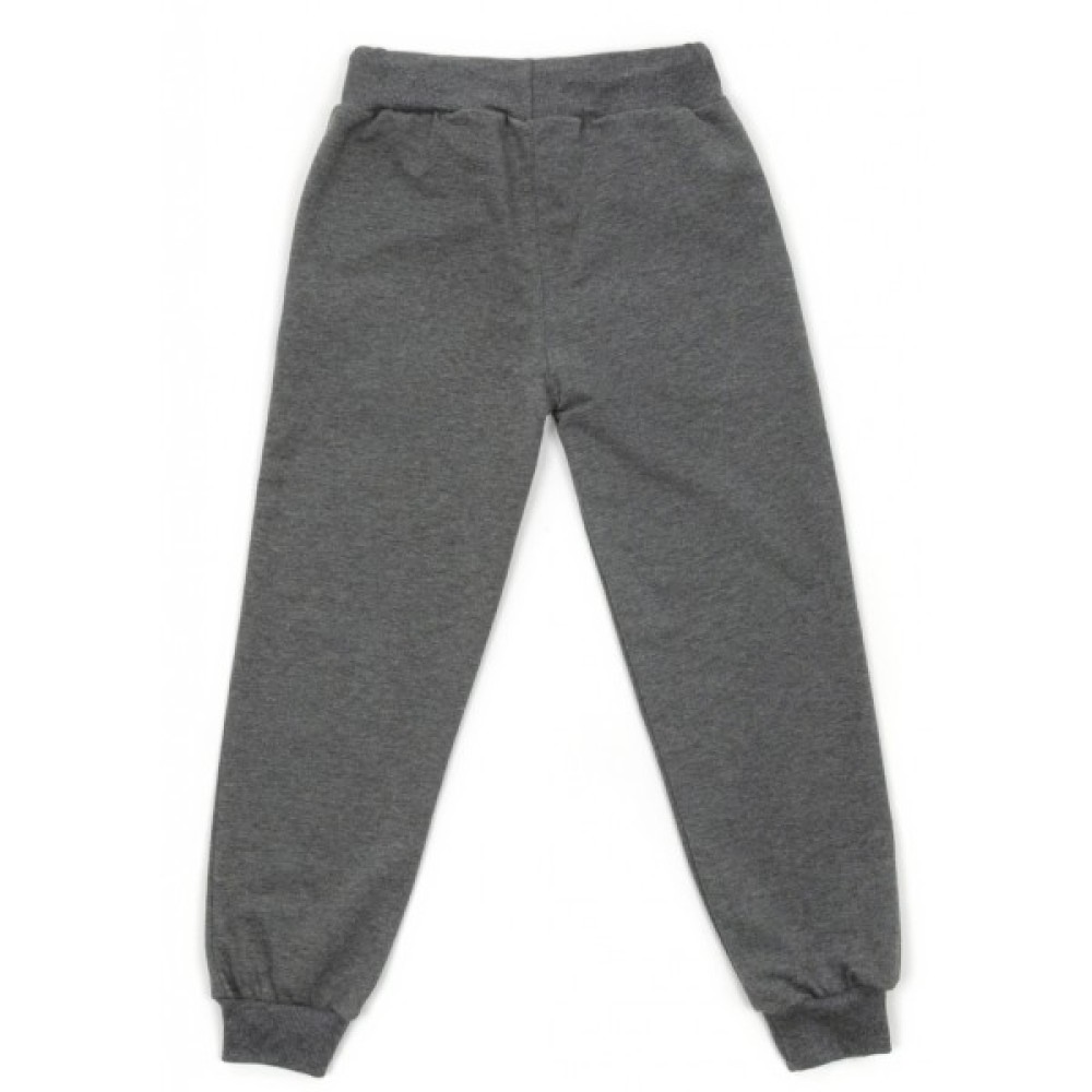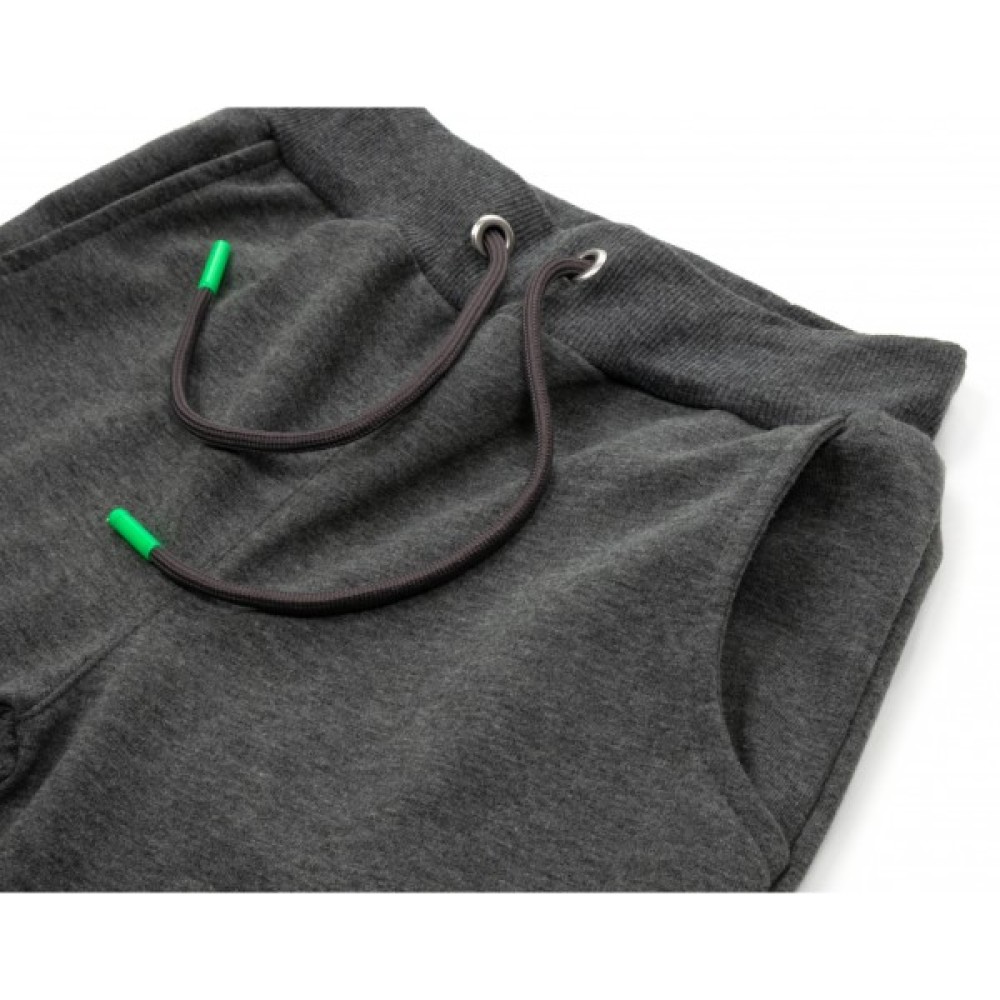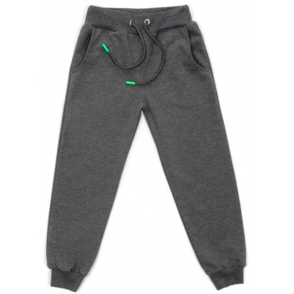 Затишні, вільного крою штани, меланжевого кольору «антрацит», на манжетах, із двома прорізними кишенями. Еластичний пояс та манжети, у подвійну трикотажну «гумку», забезпечать затишок та оптимальну посадку по фігурі. Пояс додатково посилено широкою вставленою «гумкою» і шнурком, що діє.