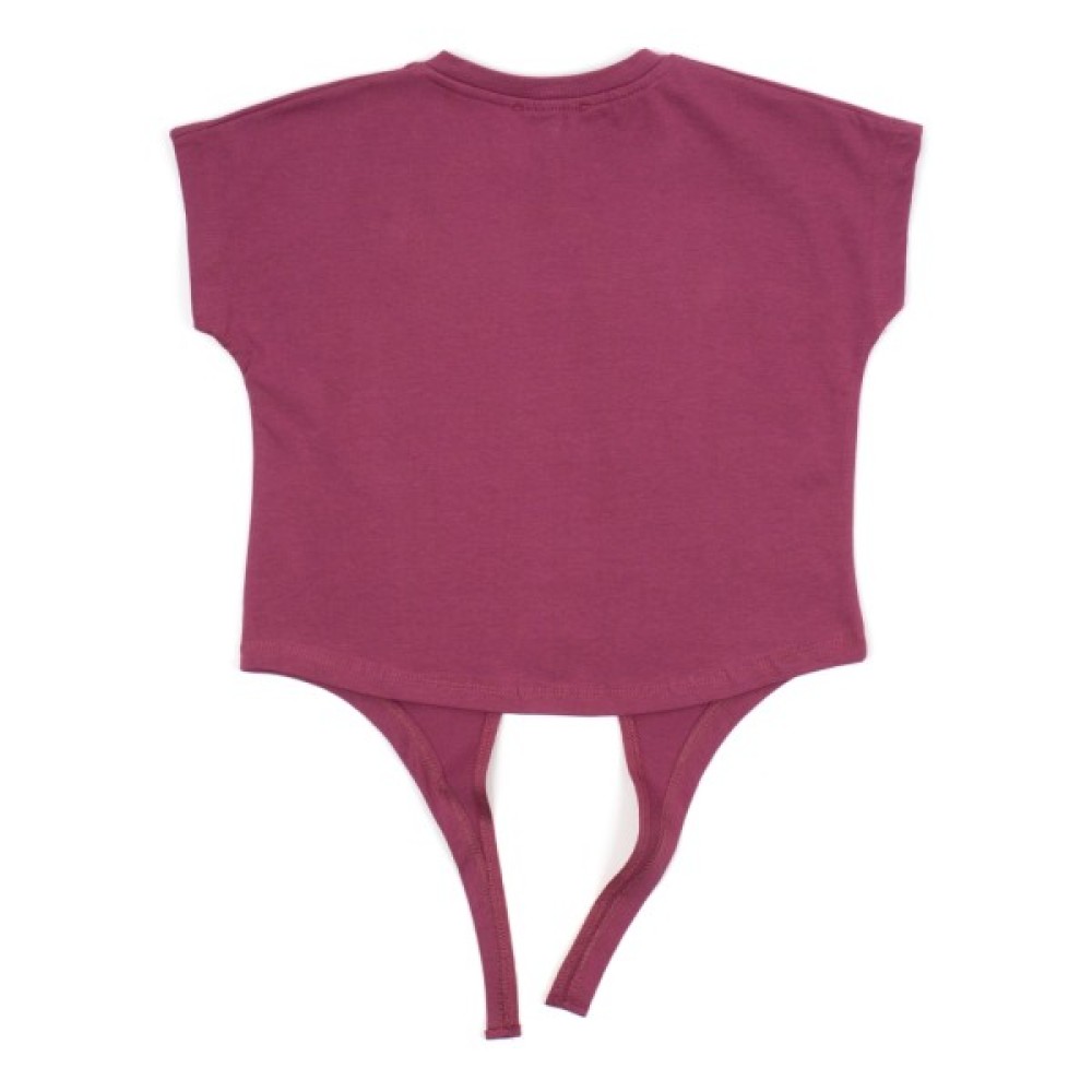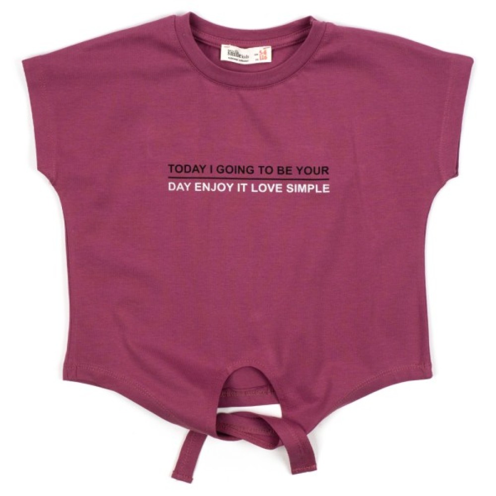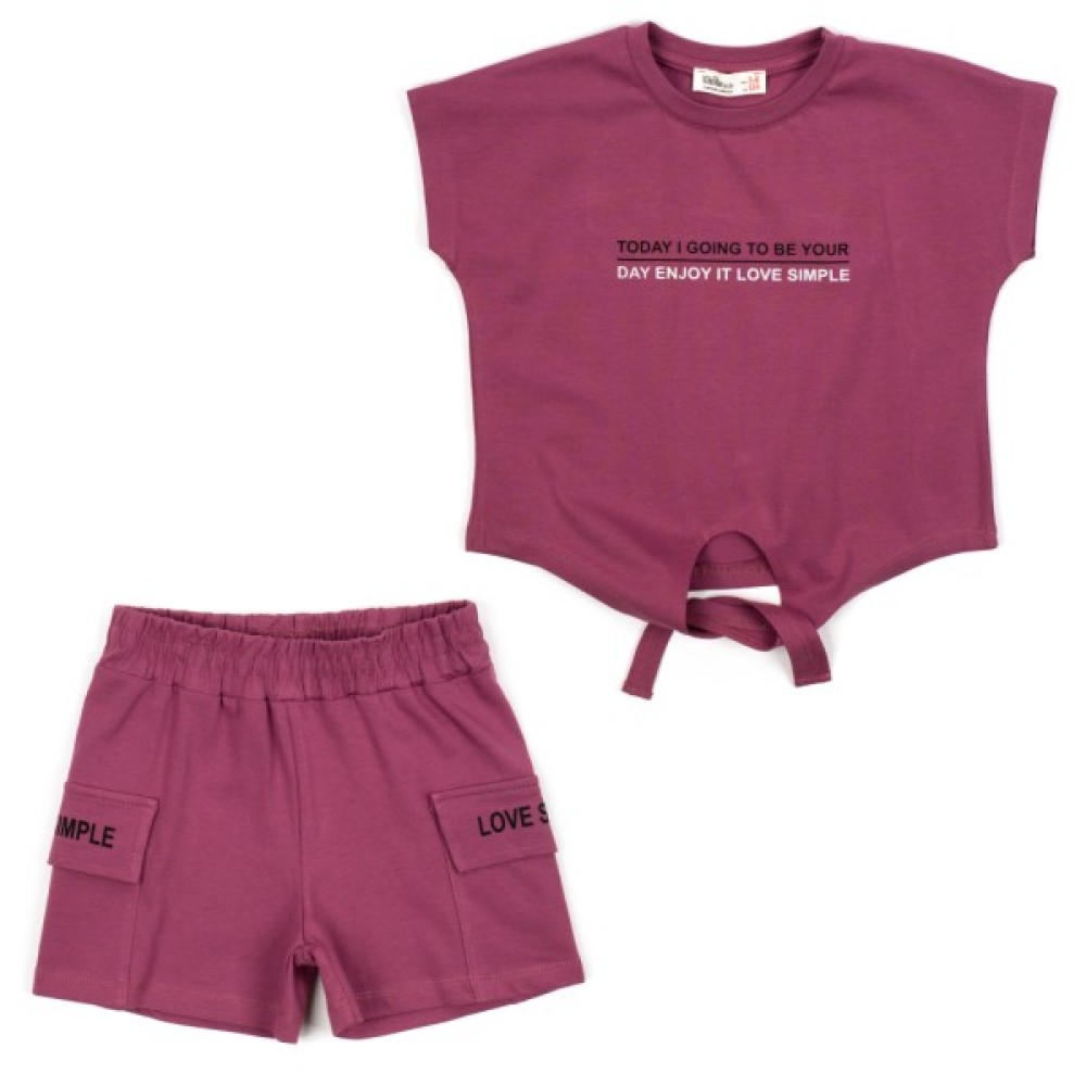 • Симпатичний трикотажний комплект для дівчинки, приємного сливового кольору, прикрашений стильними принтовими написами чорного та сріблястого кольору: футболка та шортики з накладними кишенями.