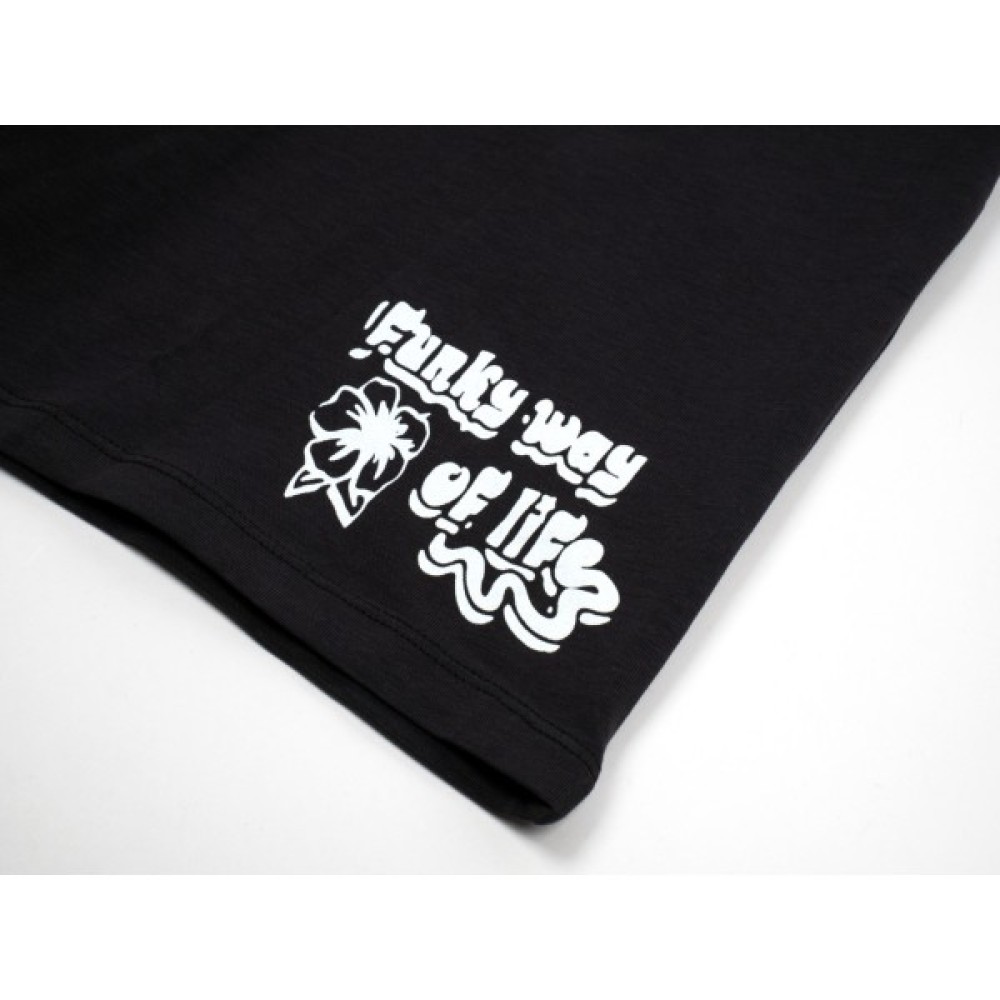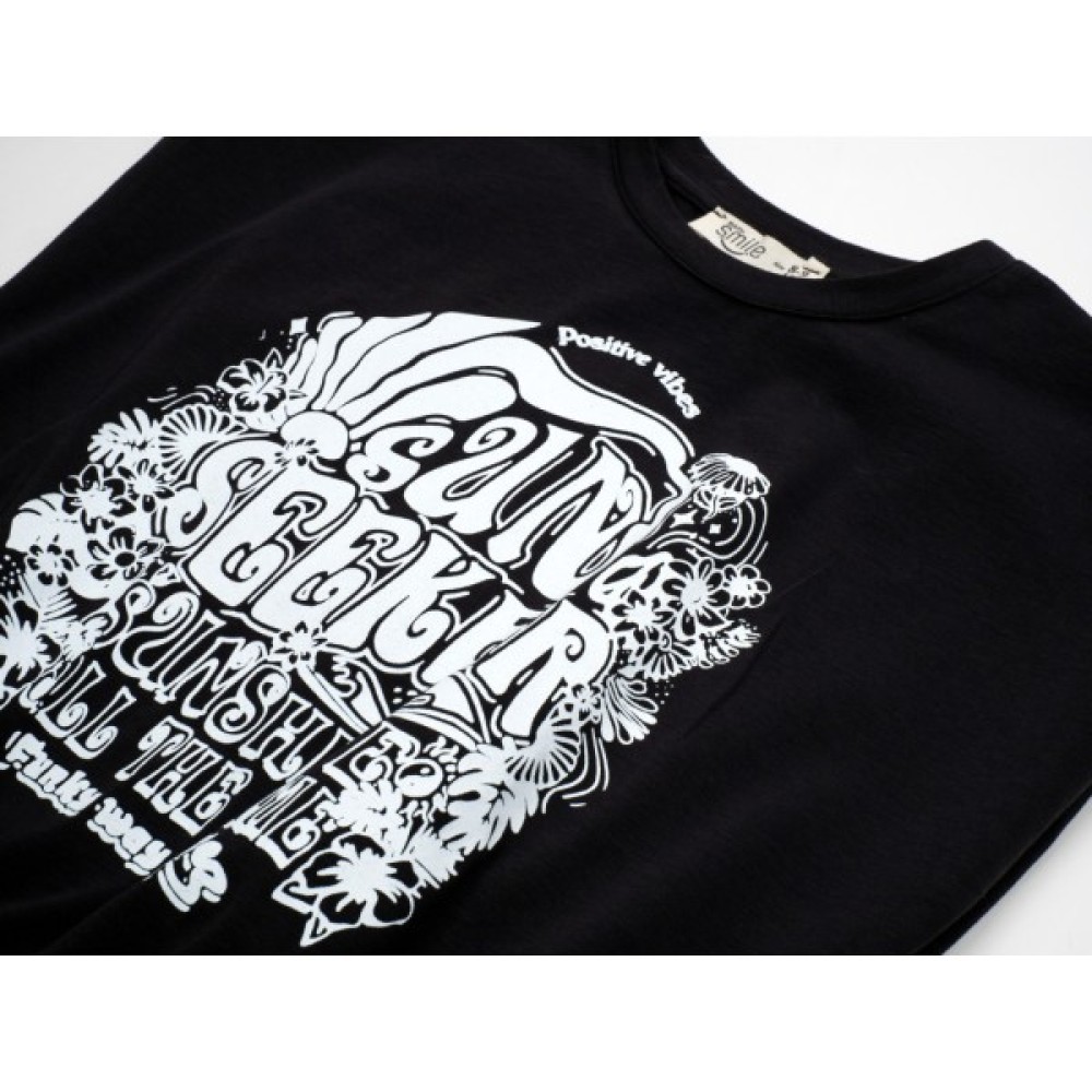 Прикрашена на грудях великим об'ємним принтовим малюнком білого кольору у вигляді квітів і написів.