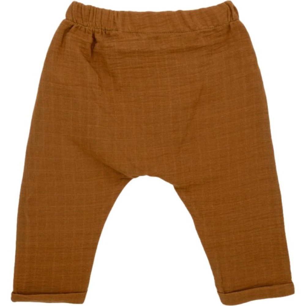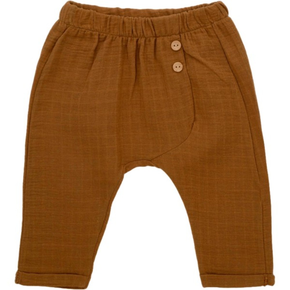 • Штанці зручні, вільні, без середнього шва (шва сидіння), ефектного стильного покрою - зі зміщеним декоративним переднім швом, прикрашеним пришитими акуратними ґудзиками - "під дерево". Крій розрахований під підгузок. Пояс суцільнокроєний (з основної тканини), з додатково вставленою широкою гумкою та підгорнутими манжетиками з основної тканини по низу, забезпечать дитині повну свободу рухів, комфорт при носінні та оптимальну посадку по фігурі. Модель йде без кишень. Тканина легенька, приємна на дотик.