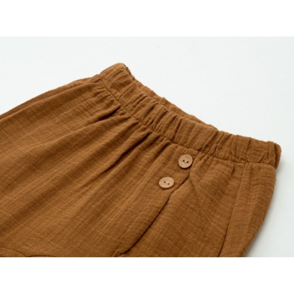• Штанці зручні, вільні, без середнього шва (шва сидіння), ефектного стильного покрою - зі зміщеним декоративним переднім швом, прикрашеним пришитими акуратними ґудзиками - "під дерево". Крій розрахований під підгузок. Пояс суцільнокроєний (з основної тканини), з додатково вставленою широкою гумкою та підгорнутими манжетиками з основної тканини по низу, забезпечать дитині повну свободу рухів, комфорт при носінні та оптимальну посадку по фігурі. Модель йде без кишень. Тканина легенька, приємна на дотик.