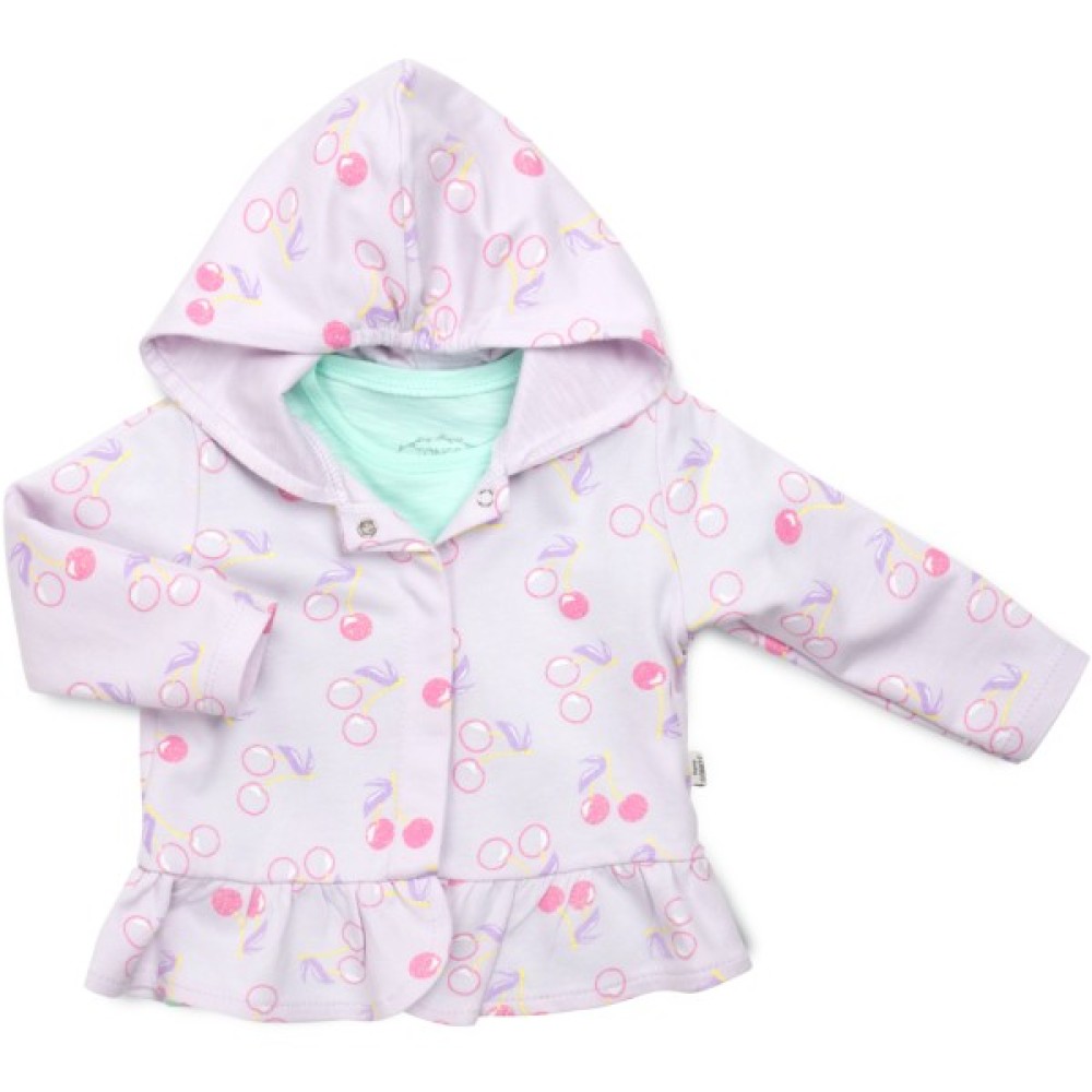 Жакет з капюшоном, приємного світло - бузкового кольору, з легким, трохи помітним глітерним блиском на вишеньках.
