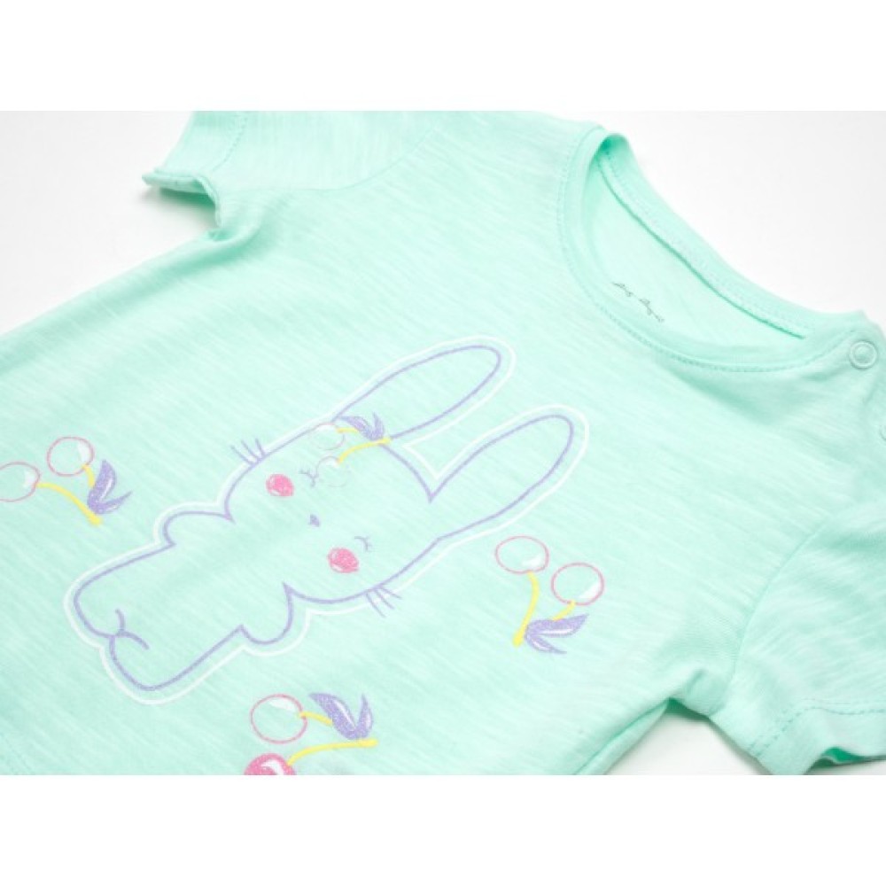 Футболочка прямого силуету, зшита із тонкого трикотажу. У плечовому шві є застібка на дві кнопочки, що полегшить процес надягання. Оздоблена принтовим малюнком милого зайчика.