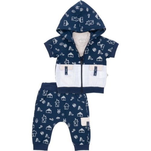 • Жилет виконаний в стильних комбінованих синьо-білих кольорах, з натуральної дихаючої бавовняної тканини, під трикотажну гумку по низу, з короткими рукавами на манжетах з трикотажної гумки та з нез'ємним каптуром. Застібається на якісну капронову блискавку з металевим бігунком та дуже зручним, легким ходом. Прикрашений контрастними принтовими малюночками по всій поверхні та вшитими декоративними бежевими клапанами з матовими кнопочками та стильними декоративними стрічками.