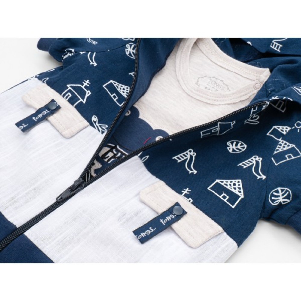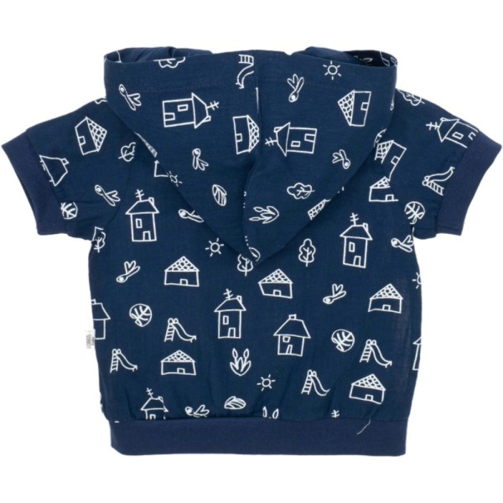 • Жилет виконаний в стильних комбінованих синьо-білих кольорах, з натуральної дихаючої бавовняної тканини, під трикотажну гумку по низу, з короткими рукавами на манжетах з трикотажної гумки та з нез'ємним каптуром. Застібається на якісну капронову блискавку з металевим бігунком та дуже зручним, легким ходом. Прикрашений контрастними принтовими малюночками по всій поверхні та вшитими декоративними бежевими клапанами з матовими кнопочками та стильними декоративними стрічками.