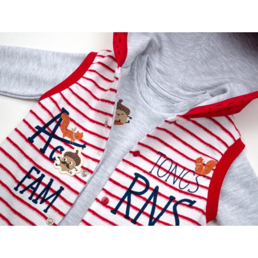 Жилет з капюшоном, застібається на кнопки. Капюшон подвійний, всередині на трикотажній підкладці сірого кольору. Спереду жилет прикрашений написами і малюнками білочок і жолудів.