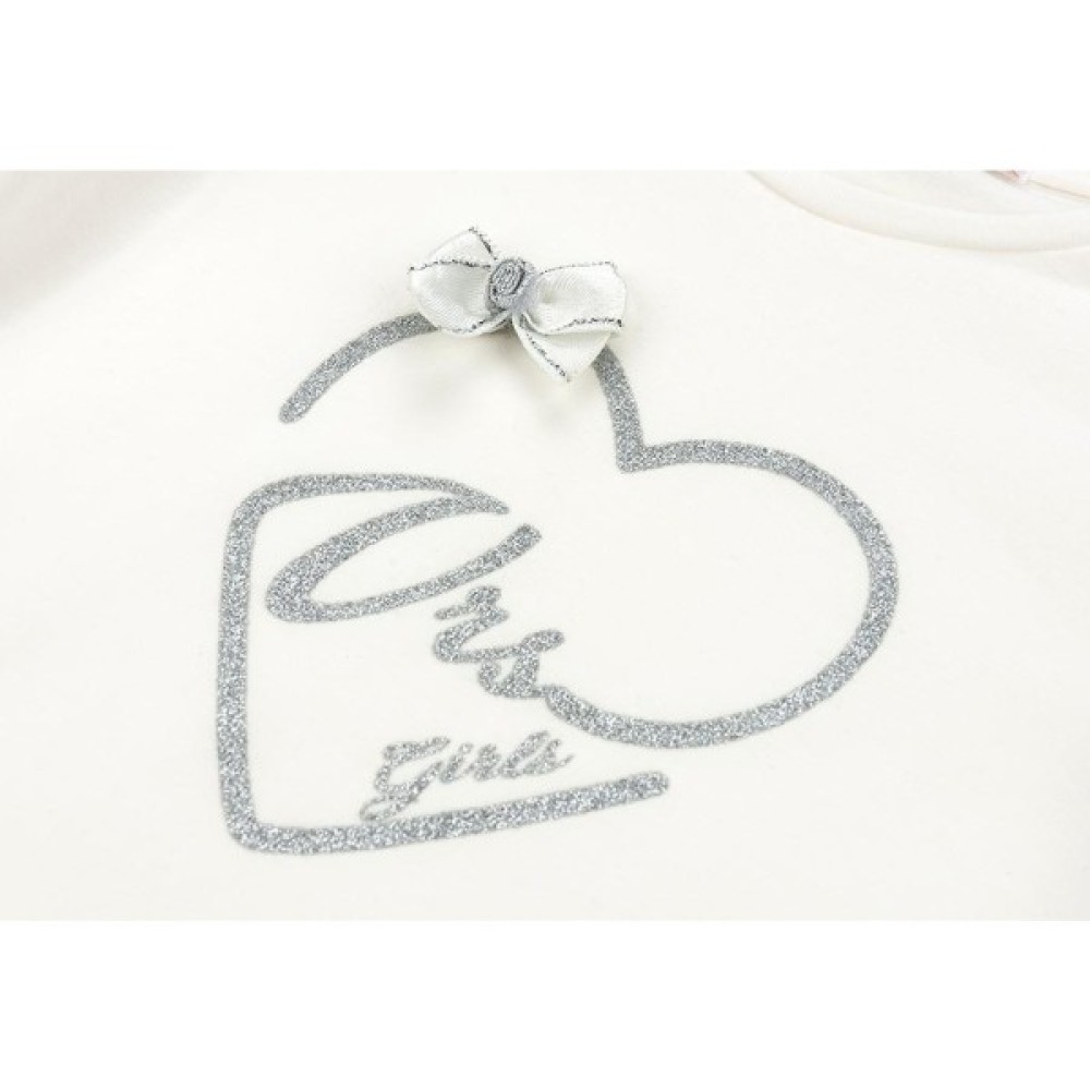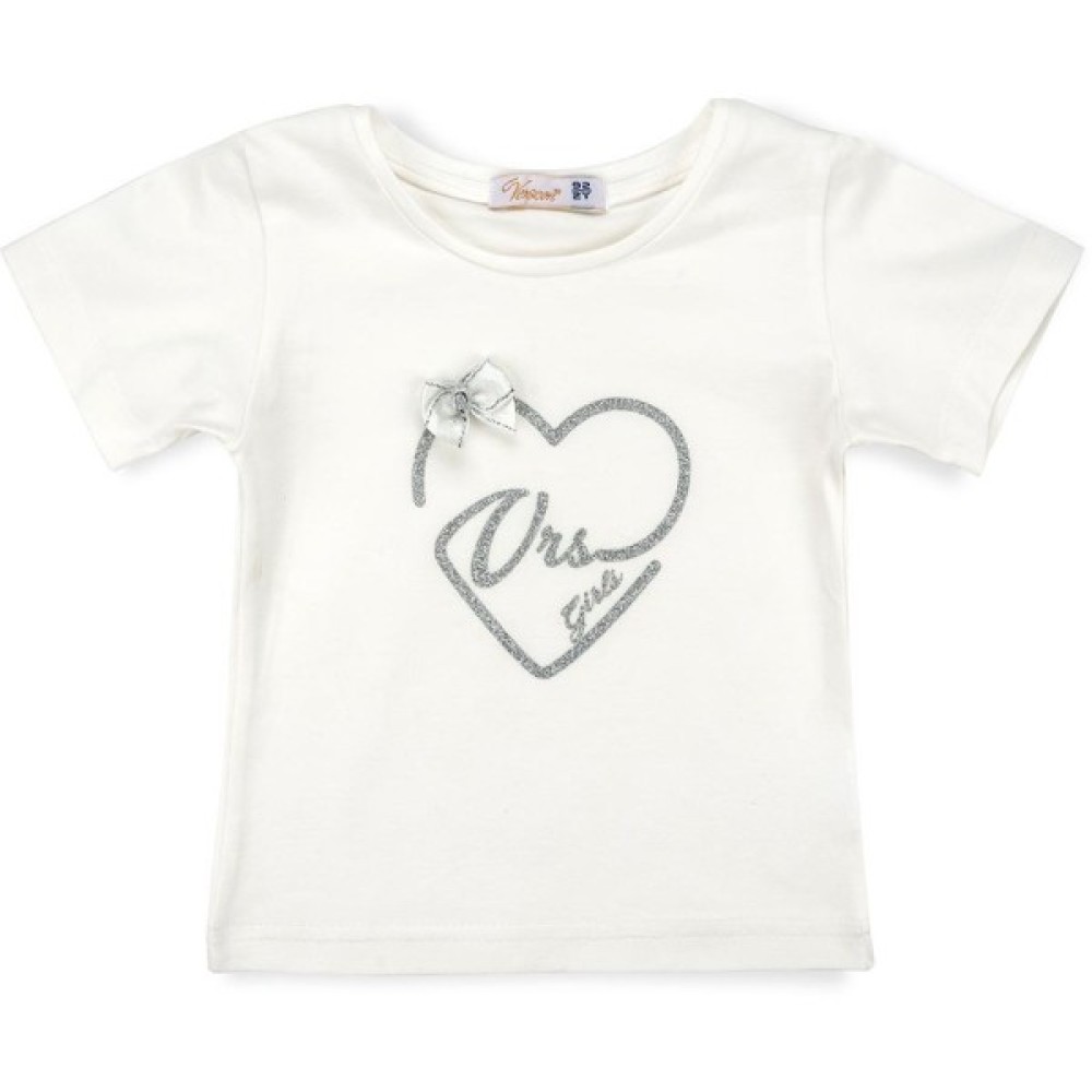 Симпатична футболочка прямого силуету, з коротким рукавом, зшита з тонкого, але щільного турецького трикотажу на основі натуральної бавовни, з додаванням невеликого % еластану для підтримки форми. Футболка прикрашена міцним, глітерним, блискучим принтом у вигляді серця з написами і невеликим, милим атласним бантиком з мініатюрною трояндочкою зі сріблястої, тонкої стрічки. Еластична кругла горловина, яка оформлена ніжною трикотажною обтачкою, та еластичний трикотаж полегшать процес одягання.