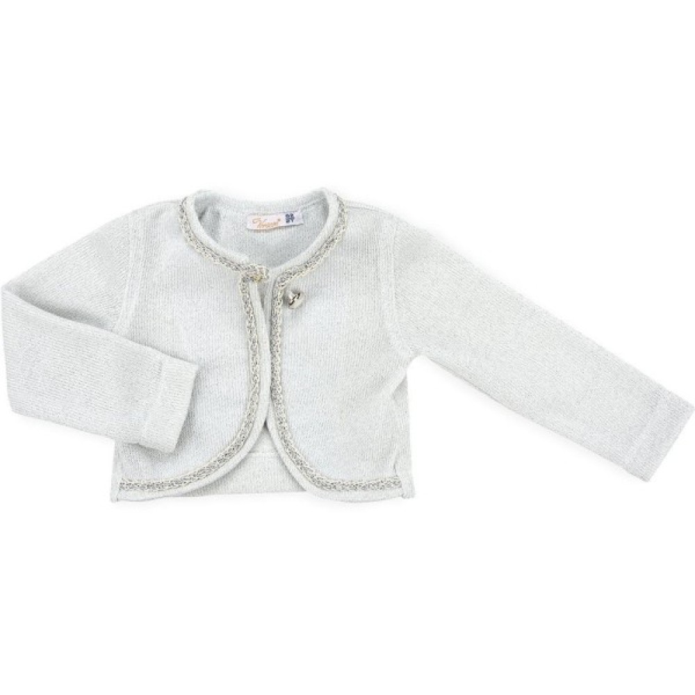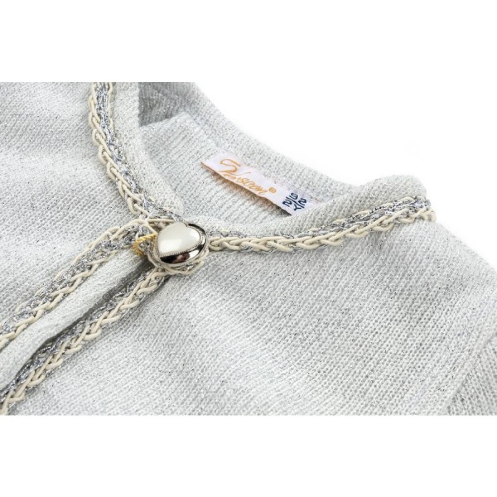 Красиве, затишне болеро з м'якого, трикотажного полотна джерсі зі сріблястим люрексом (100% поліестер), додатково прикрашене блискучою, декоративною, плетеною тасьмою. Застібається на ефектний ґудзик у вигляді перлового сердечка в срібній оправі.