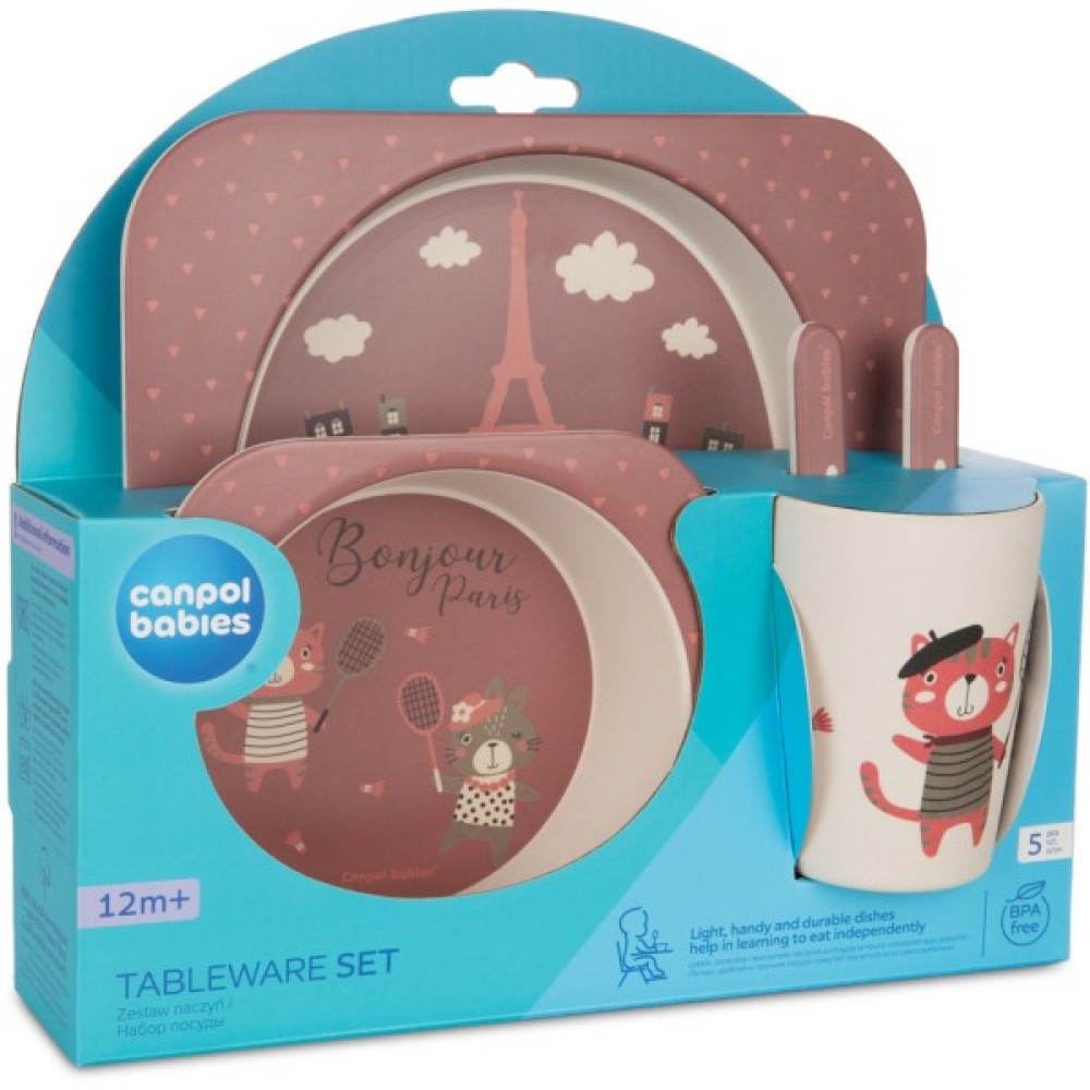Набір посуду Canpol Babies Bonjour Paris - це екологічно чиста альтернатива класичному посуду з пластику. Набір посуду виготовлено з міцних, стійких та придатних для контакту з харчовими продуктами матеріалів з використанням натуральної сировини –50% деревного борошна і 30% харчового кукурудзяного крохмалю (і 20% меламінової смоли).
