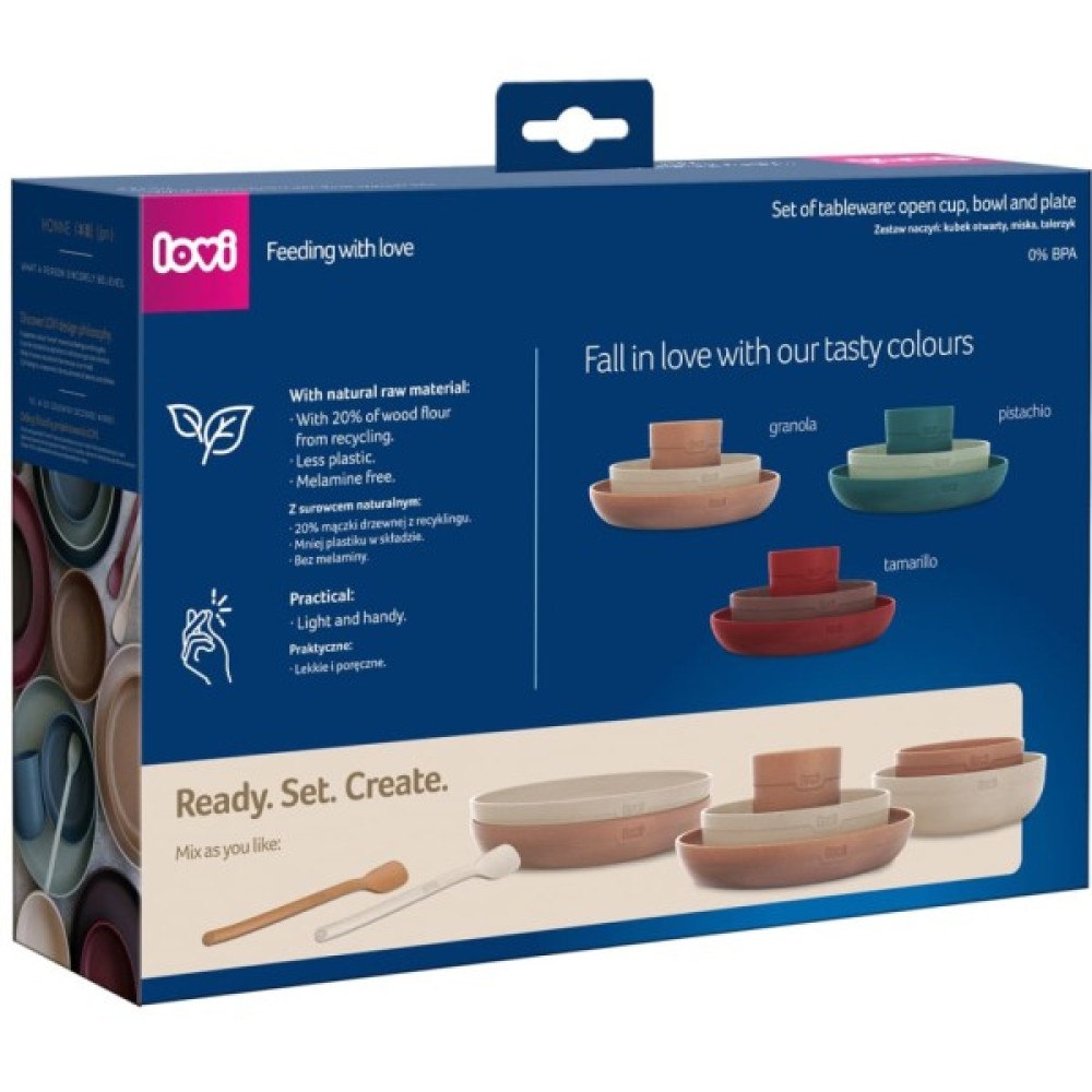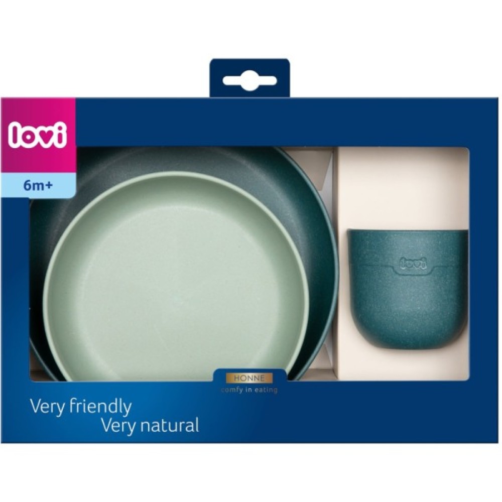 LOVI Набір посуду з кружкою. Виготовлений з натуральної сировини - 20% переробленого деревного волокна. Легкий та зручний - підходить для будь-якого віку дитини. Безпечний для малюка - без вмісту BPA. Набір посуду - всі елементи необхідні для розширення раціону. На вибір мисочка, тарілочка та кружечка - для різних страв. Чудовий варіант подарунку.