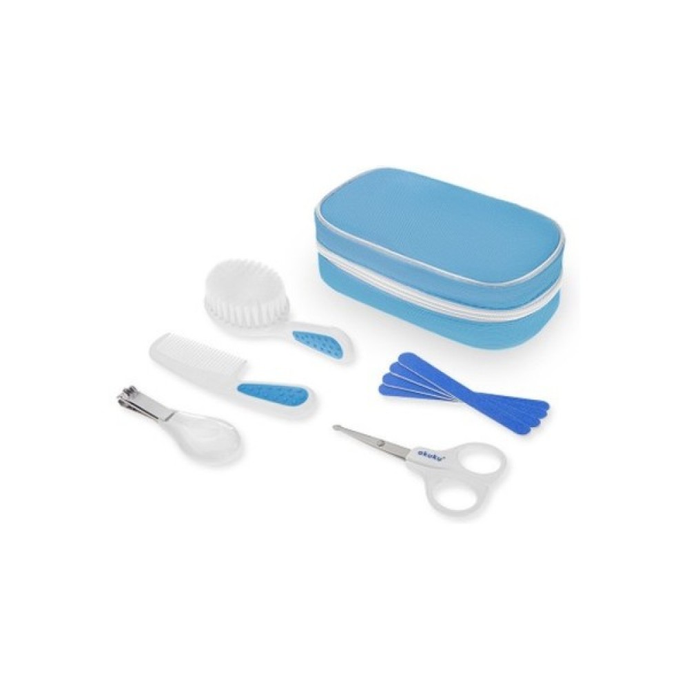 Манікюрний набір для догляду за дитиною у зручній та практичній косметичці. Ножиці (з тонкими металевими лезами та закругленими краями) та кусачки допоможуть вам безпечно та надійно обрізати маленькі нігті, а пилка легко усуне нерівності нігтя, оберігши малюка від подряпин. М'яка щітка і гребінець з ковзкою ручкою дозволять вам доглядати за головкою малюка. Щоб мінімізувати ризик несподіваного руху дитини, рекомендується підстригати нігті під час сну.