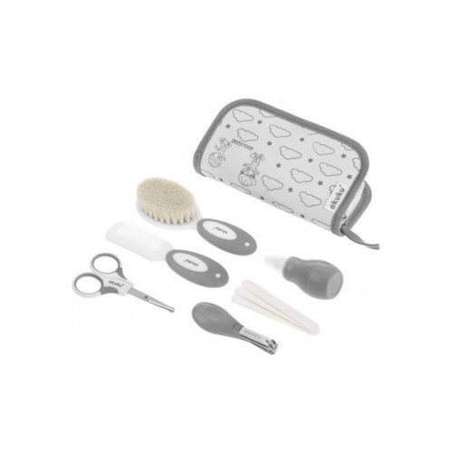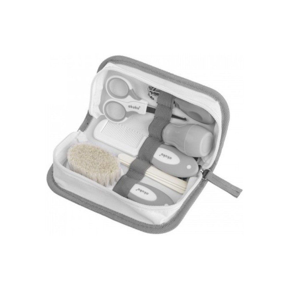 Набір по догляду за дитиною у зручній та практичній косметичці. Ножиці (з тонкими металевими лезами та закругленими краями) та кусачки допоможуть вам безпечно та надійно обрізати нігті. Пилка легко прибере нерівності нігтя, захистивши дитину від подряпин. М'яка щітка і гребінець з ковзною ручкою подбають про головку вашого малюка. Груша з м'яким наконечником призначена для очищення дихальних шляхів та видалення води та сірки з вух дитини.