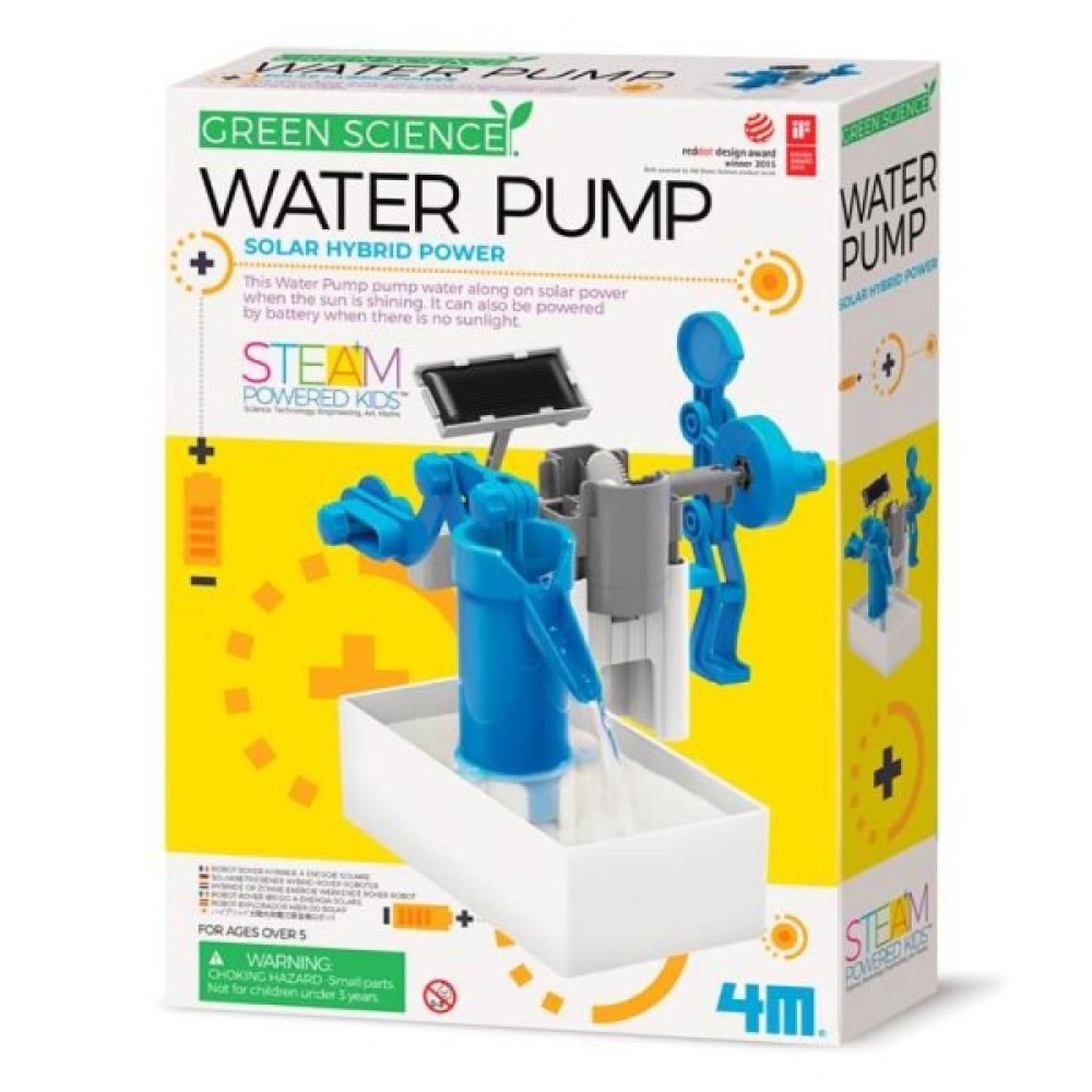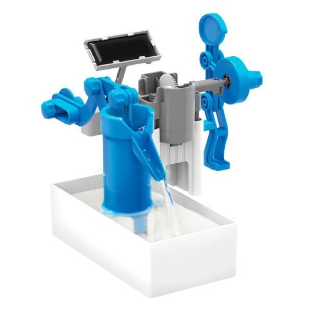 Науковий набір від 4M Водяний насос на сонячній батареї дозволить зібрати діючу насосну установку з рухливою фігуркою чоловічка. Пристрій перетворює енергію сонця або батареї в енергію для прокачування води.