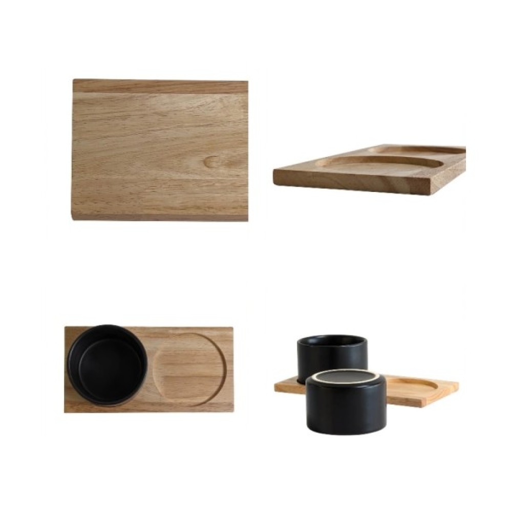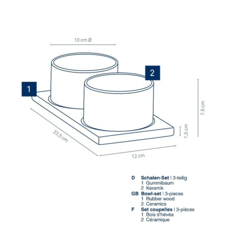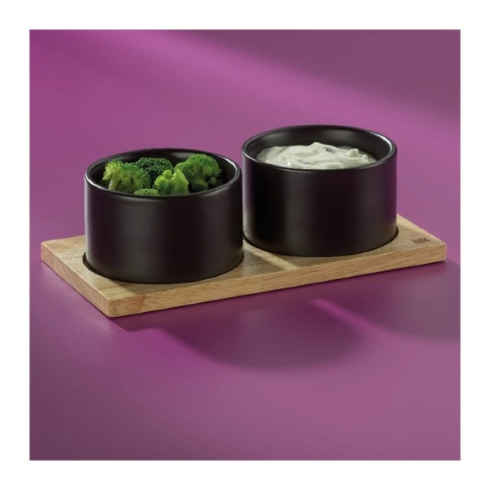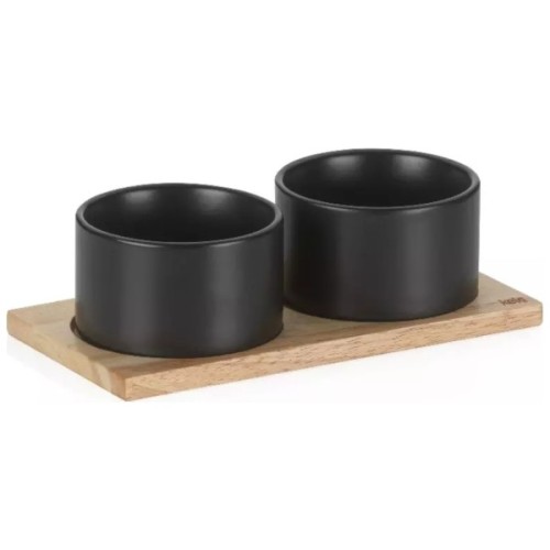 Набір для фондю KELA Gunten складається з 3 предметів: 2 круглі чашки чорного кольору з кераміки та підставки під них із каучукового дерева.