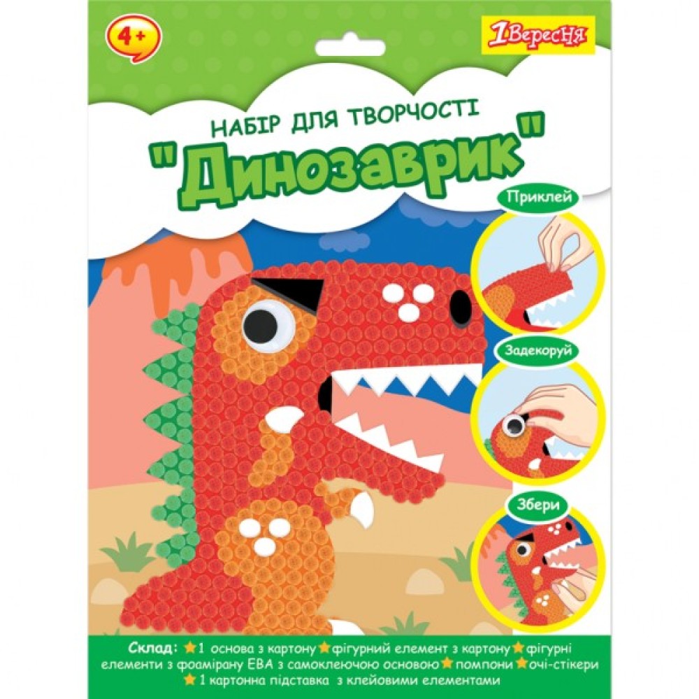 Набір для творчості 1Вересня "Динозаврик". Картонна основа з малюнком та помпони дозволяють зробити яскраву аплікацію. Робота з набором розвиває уяву, творче мислення дитини, увагу та дрібну моторику. Матеріал: картон, фоаміран ЕВА, поліестер, пластик.