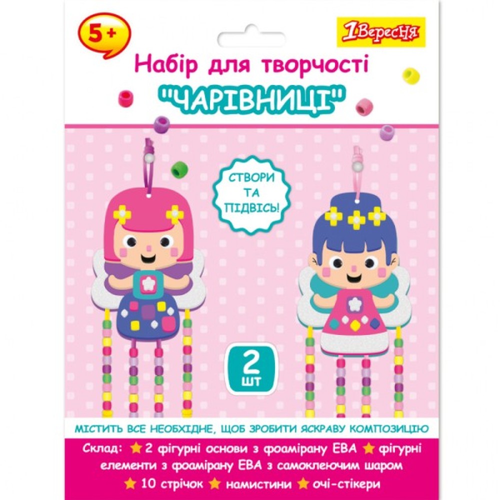 Набір для творчості 1Вересня "Феї". Готові форми з самоклеючим шаром, стрічки та намистини дозволяють зробити яскраву аплікацію без клею. Робота з набором розвиває уяву, творче мислення дитини, увагу та дрібну моторику. Матеріал: фоаміран ЕВА, поліестер, пластик.