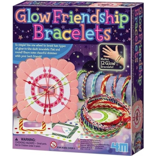 Набір для творчості «Браслети, що світяться» (00-04662) від «4M» пропонує створити браслети різного плетіння і орнаменту, використовуючи різнокольорові нитки і п'яльця різних форм.