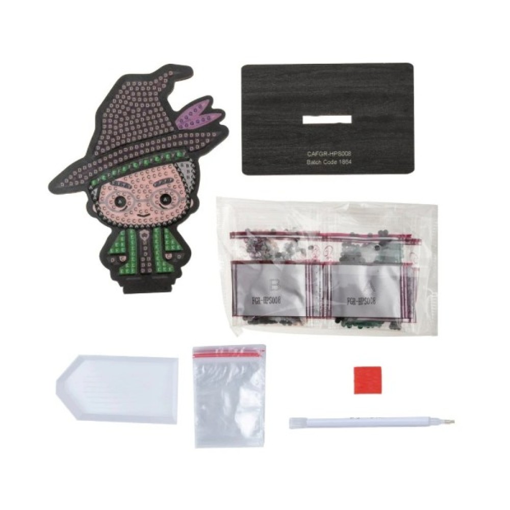 В набір входить: Дерев’яна фігурка персонажа з липкою основою. Кристали для декорування фігурки. Спеціальна ручка. Таця для кристалів. Віск. Пакетики для зберігання зайвих кристалів. Дерев’яна підставка для фігурки.
