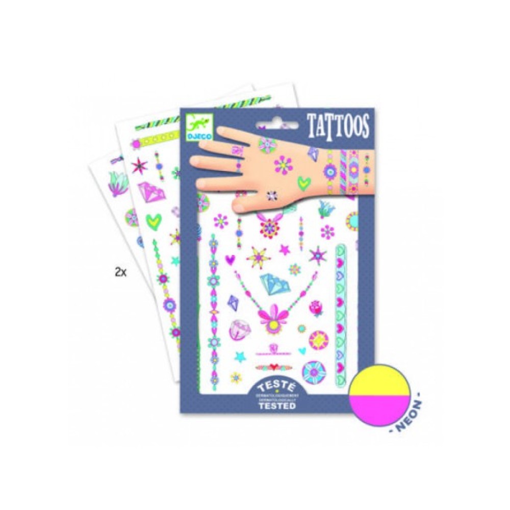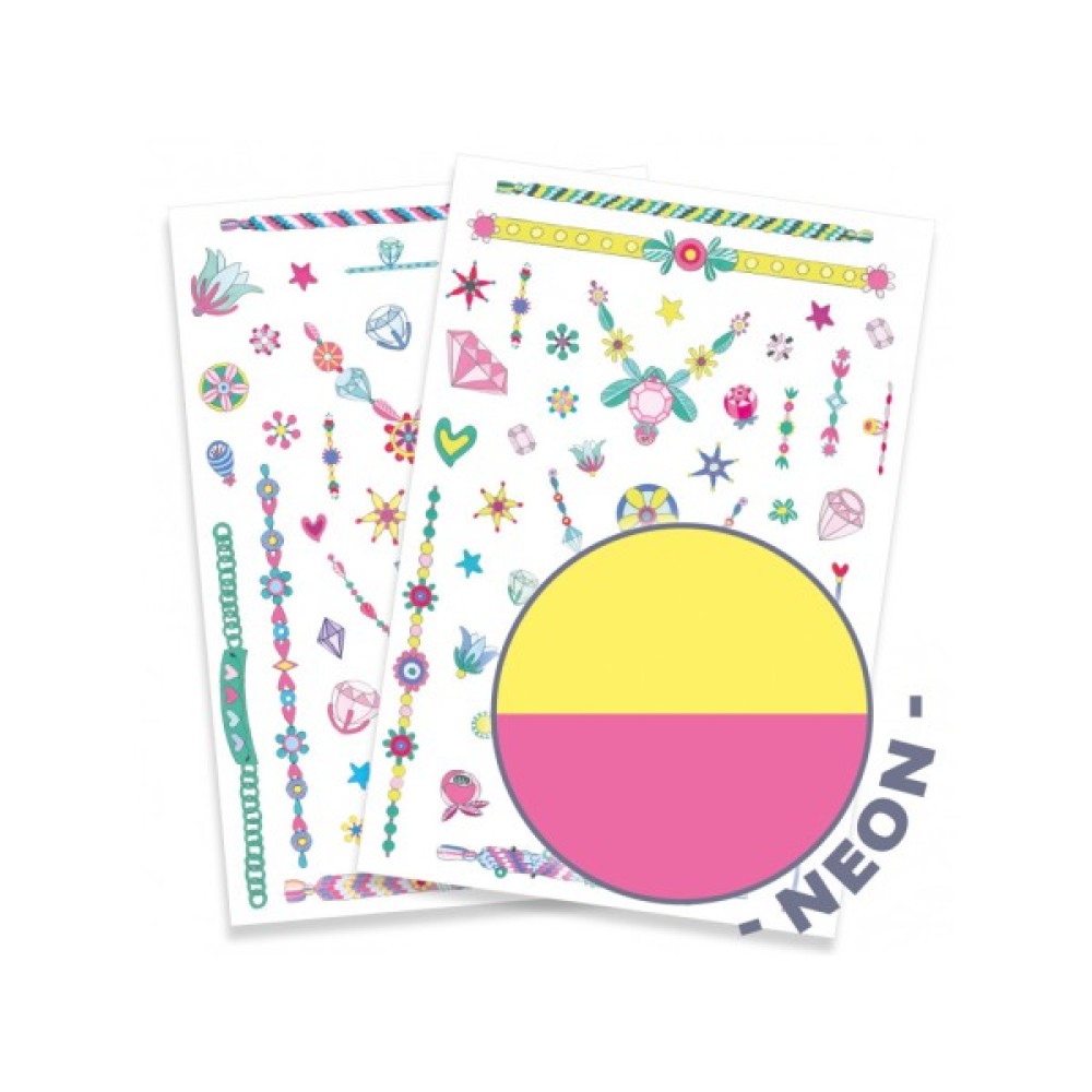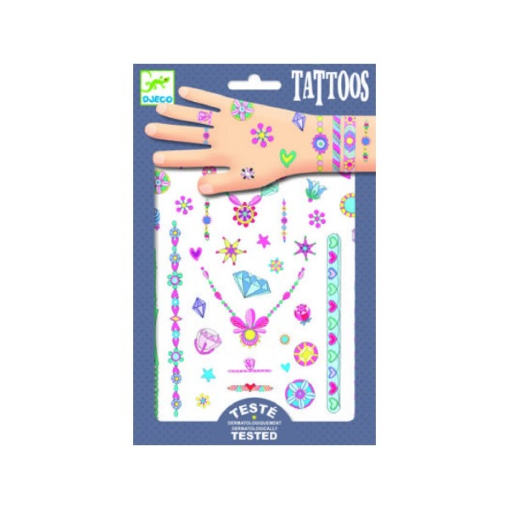 Їх можна клеїти на руки, ноги, шию, створюючи модний і стильний образ. Аксесуари прикрашені камінням і квіточками, які витончено промальовані художниками французької компанії DJECO.