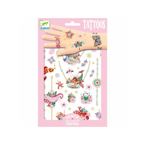 Кожен аксесуар прикрашений яскравими намистинами, квіточками. Фішкою є ніжні морські образи: русалки, рибки і черепашки. Дитячі татуювання для дівчаток можна використовувати для свята або звичайної гри з подругами. Вони легко кріпляться до шкірі і зовсім не заважають. Батьки можуть бути впевнені в якості та безпеки татуювань від французького бренду DJECO. Набори протестовані дерматологами.