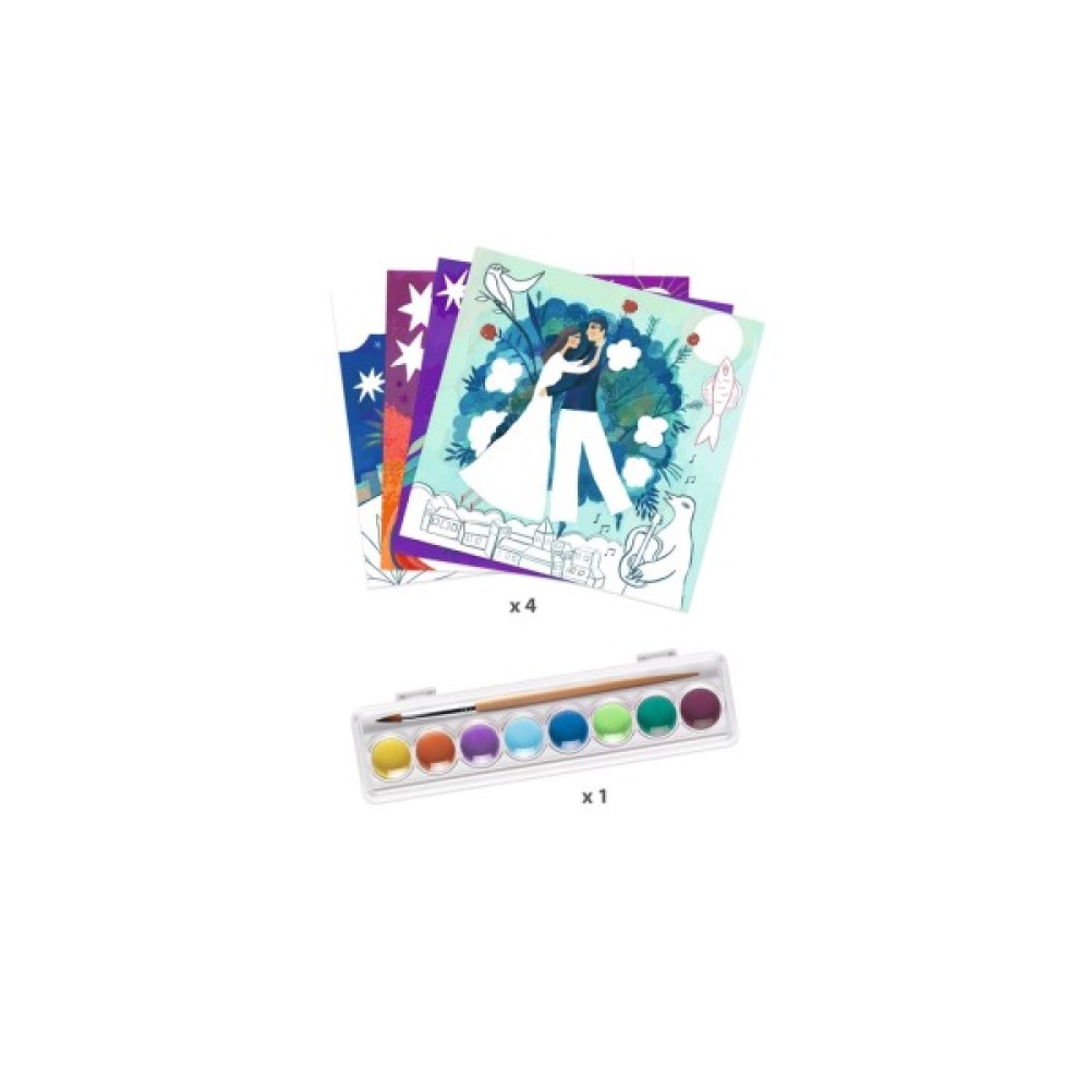 Комплектація 8 ілюстрованих карт (20 х 20 см – 4 дизайни х 2), 1 палітра з 8 кольорів гуашевих фарб, 1 пензлик, інструкція